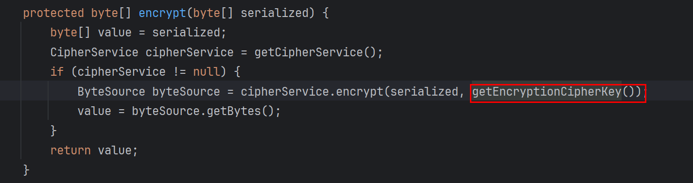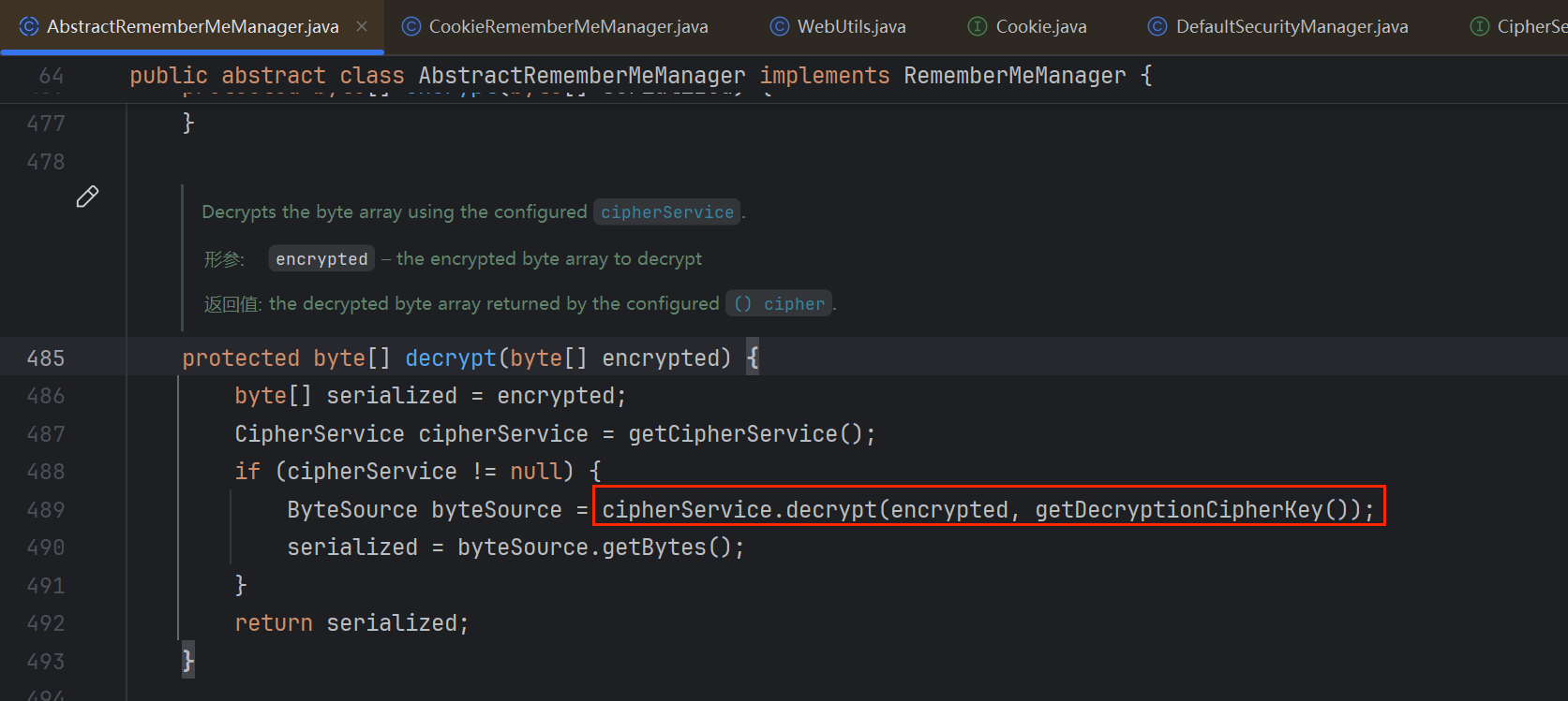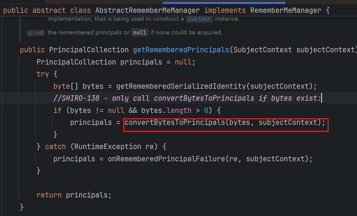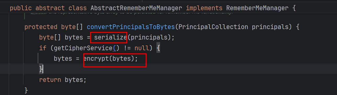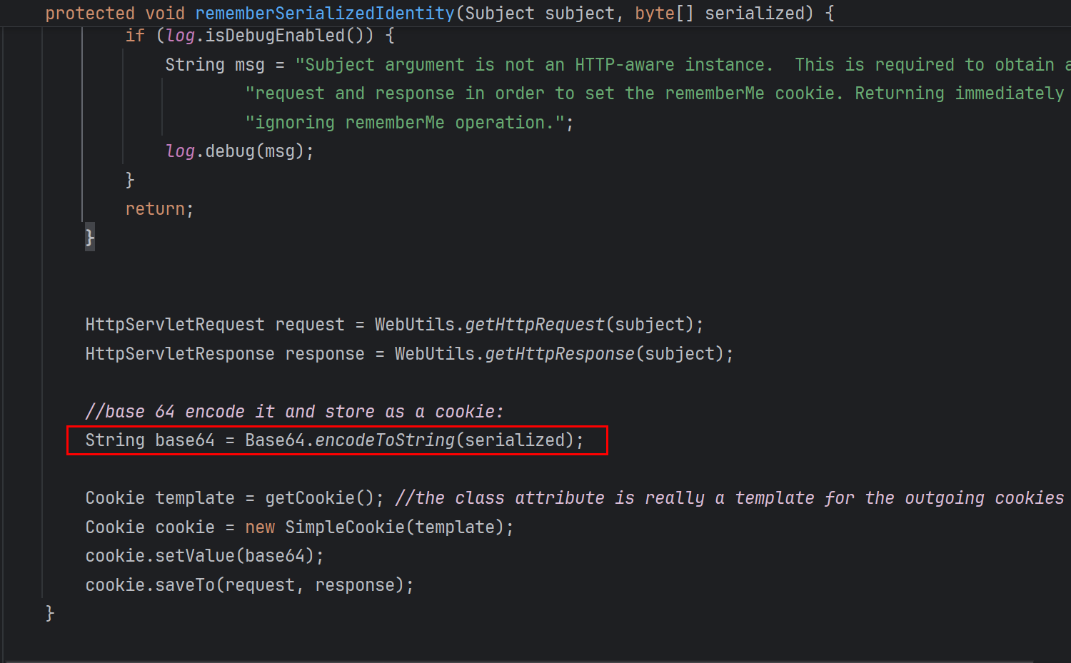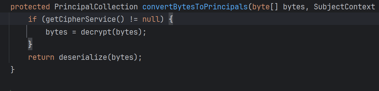 向上查找它的用法,抽象类AbstractRememberMeManager 的 getRememberedPrincipals方法中将 调自己的函数getRememberedSerializedIdentity()的结果赋值给数组bytes(即它就是base64解码之后的结果)