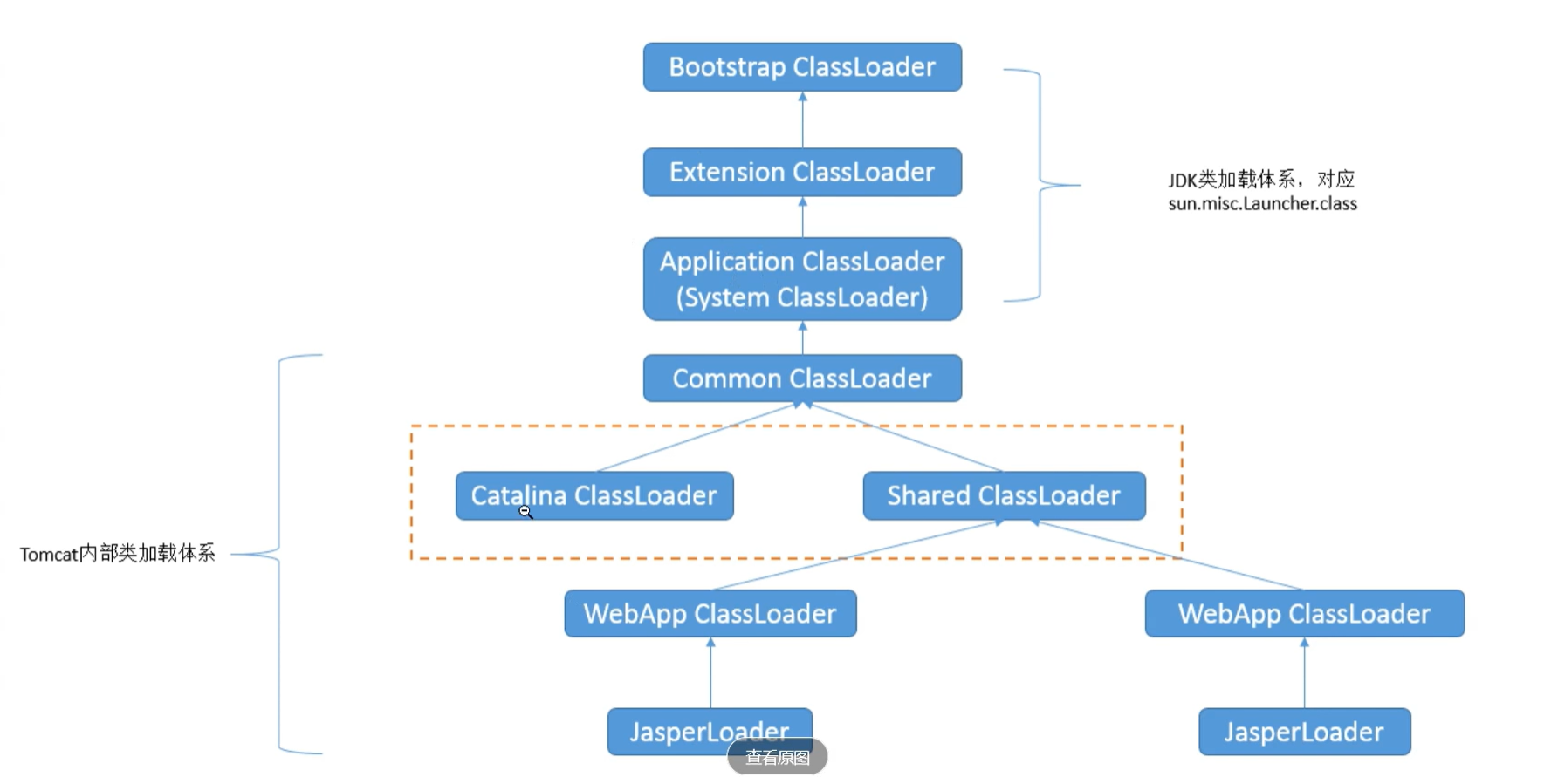 (5)如果仍然未加载成功,WebAppclassLoader 会委派给 SharedClassLoader,SharedClassLoad 再委派给 CommonClassLoader,CommonClassLoader 委派给 AppClassLoader,直到最终委派给 BootstrapClassLoader,最后再一层一层地在自己目录下对类进行加载。