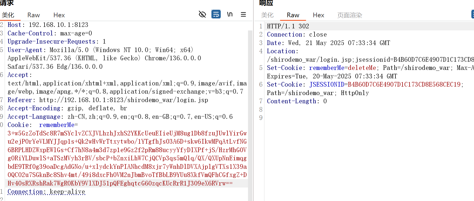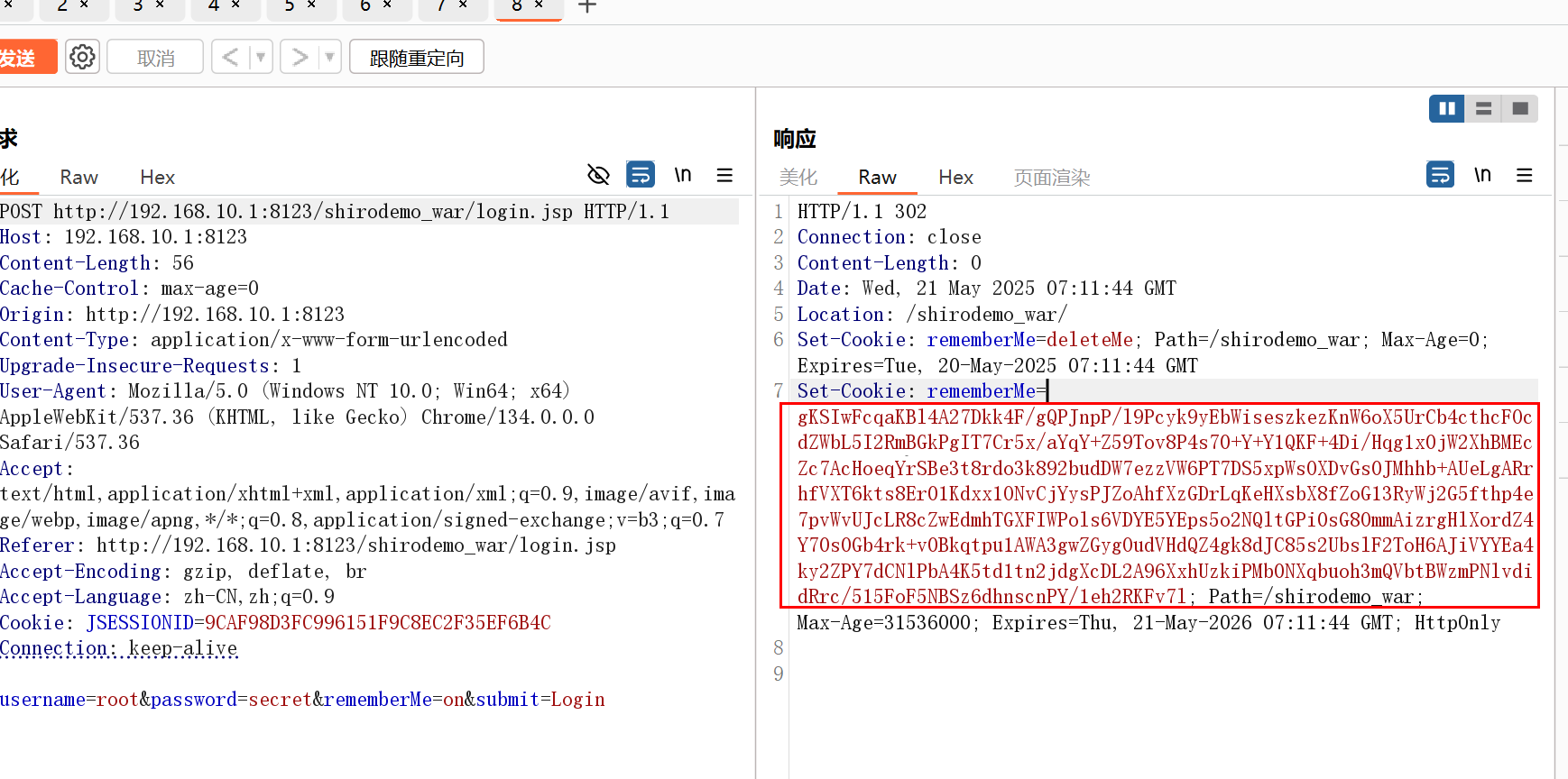 root,secret 勾选rememberMe登录抓包,看到向浏览器返回了rememberMe记录身份信息的,下一次就可以直接登录