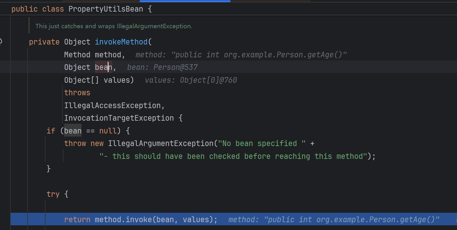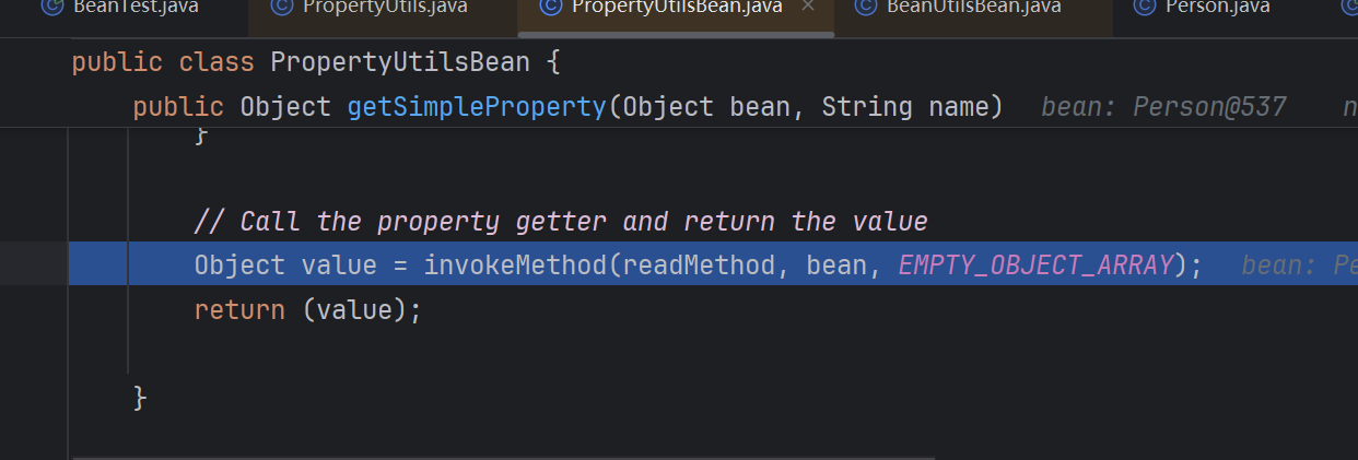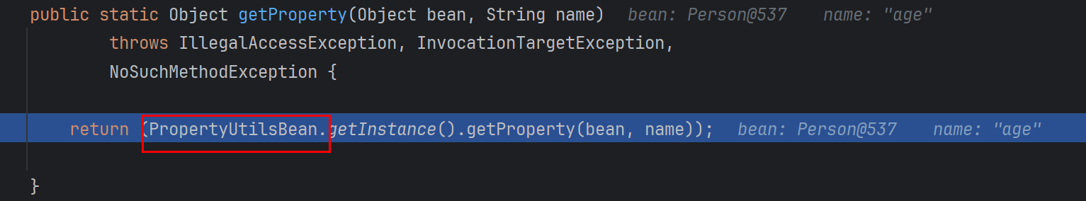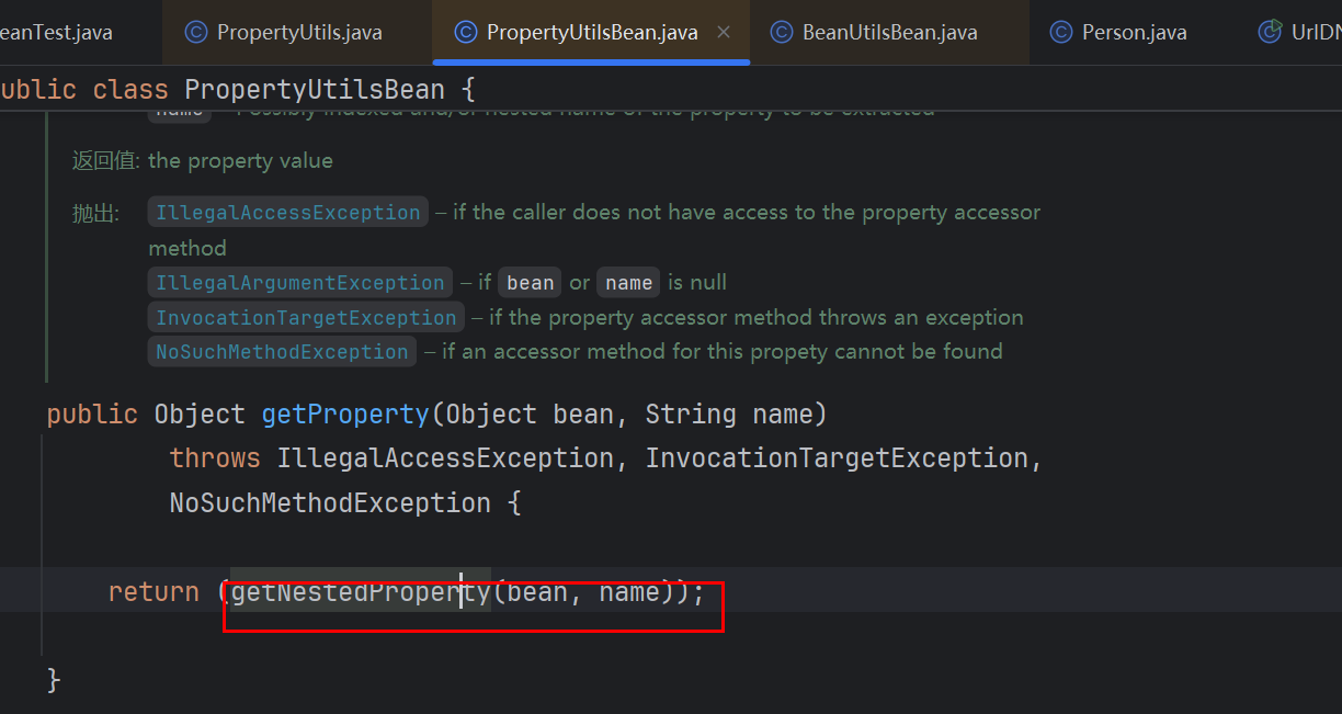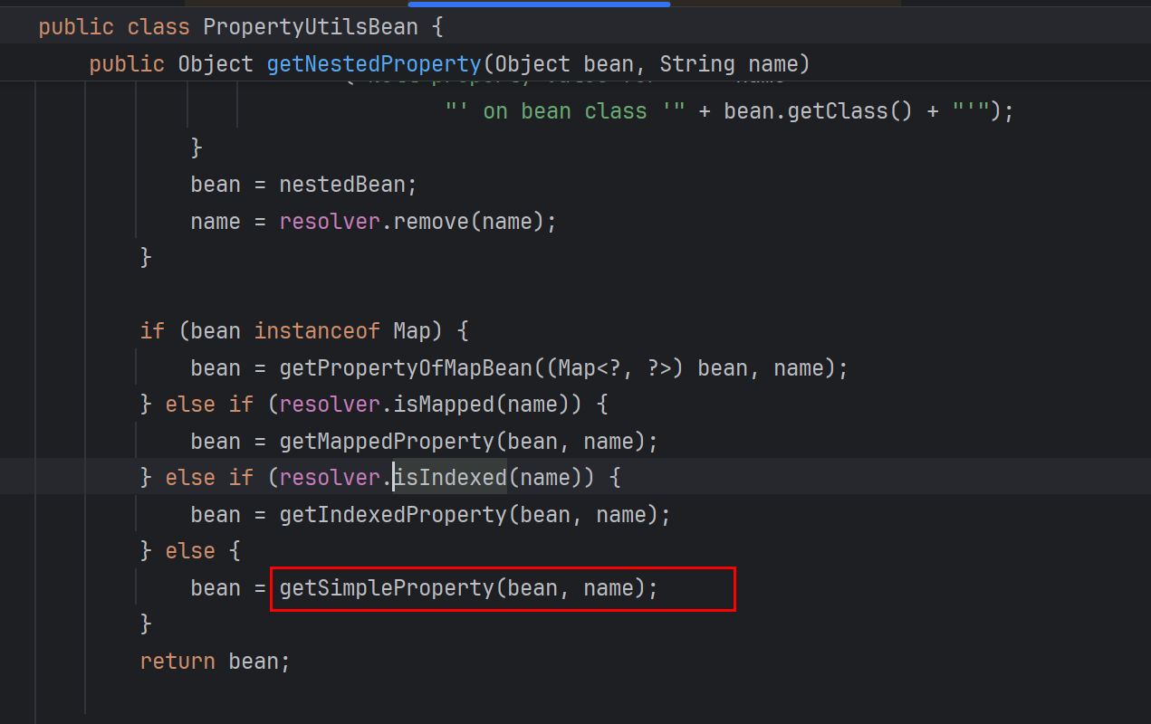 1.底层实现分析 调另一个类PropertyUtilsBean对象的getProperty,接着走到getNestedProperty方法