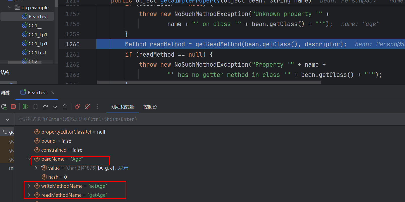 1 2 3 4 5 6 7 8 public class BeanTest { public static void main (String[] args) throws InvocationTargetException, IllegalAccessException, NoSuchMethodException { Person person = new Person ("aaa" ,18 ); System.out.println(PropertyUtils.getProperty(person,"age" )); } }