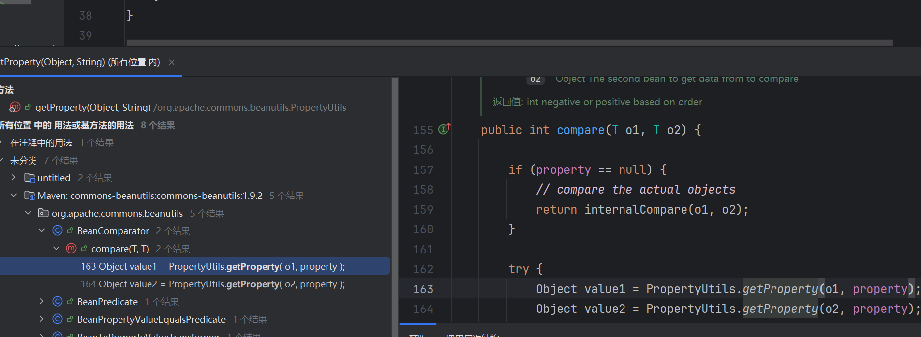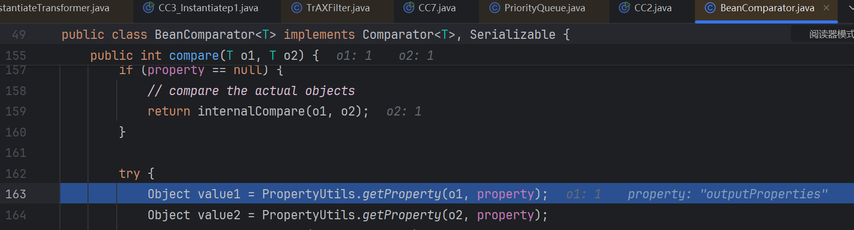 调试 走到这儿,发现是因为add后续走到的BeanComparator里面,o1为Integer,没有参数为Integer的getProperty方法
