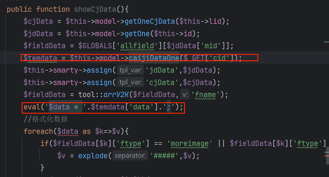 模板处容易有rce,前端为了显示一些数据,会需要执行php eval,从数据库中查询到