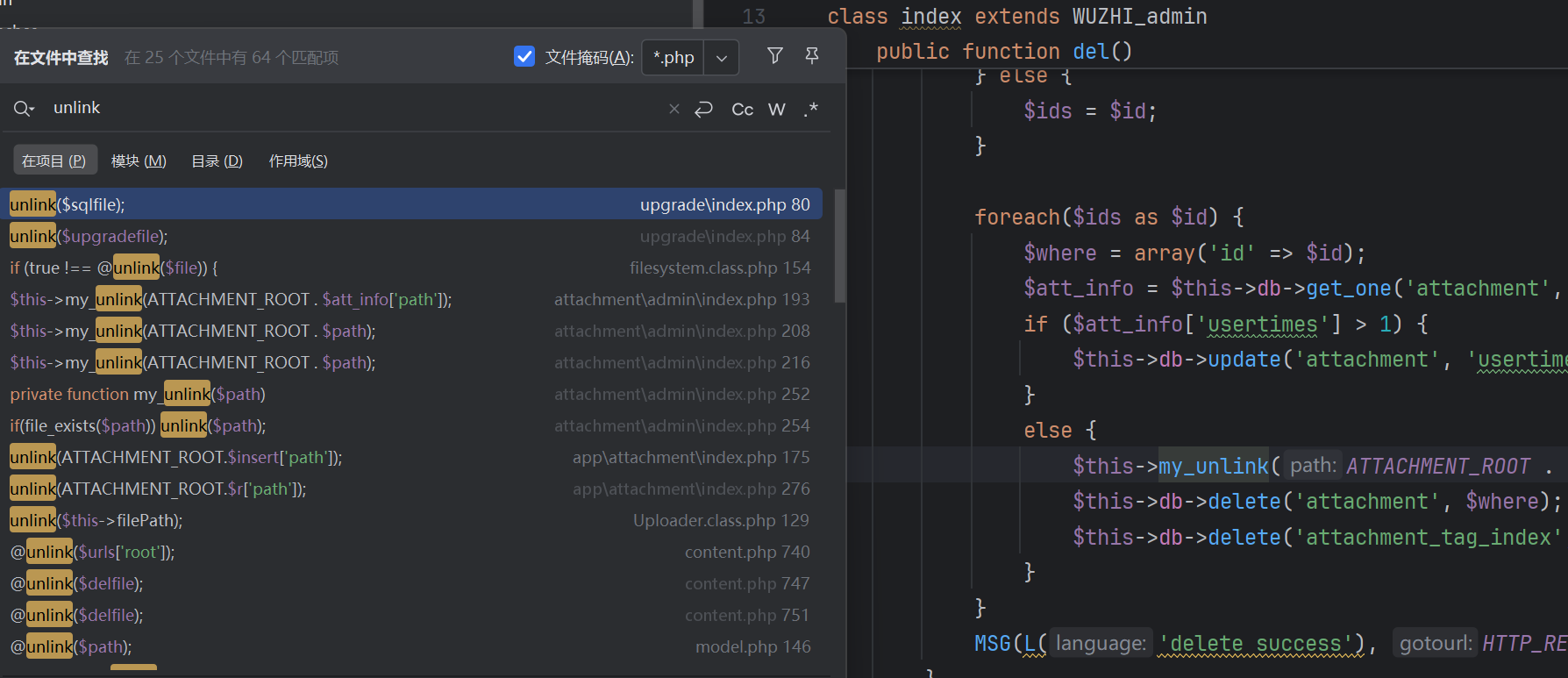 到数据库中去查找有没有对应的信息,当 id 不传入,这里$att_info 为空, 直接调用类中的 my_unlink 方法