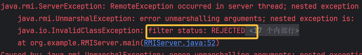 服务端 bind 攻击注册中心,换用 jdk8u131 后继续攻击注册中心会报错:信息: ObjectInputFilter REJECTED: class sun.reflect.annotation.AnnotationInvocationHandler, array length: -1, nRefs: 8, depth: 2, bytes: 284, ex: n/a