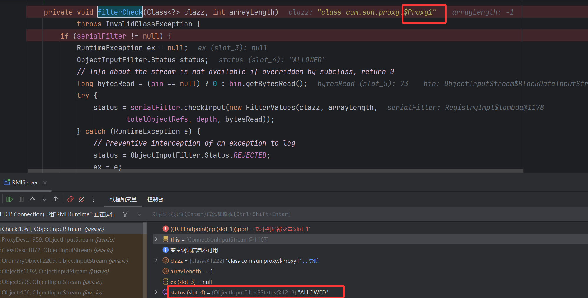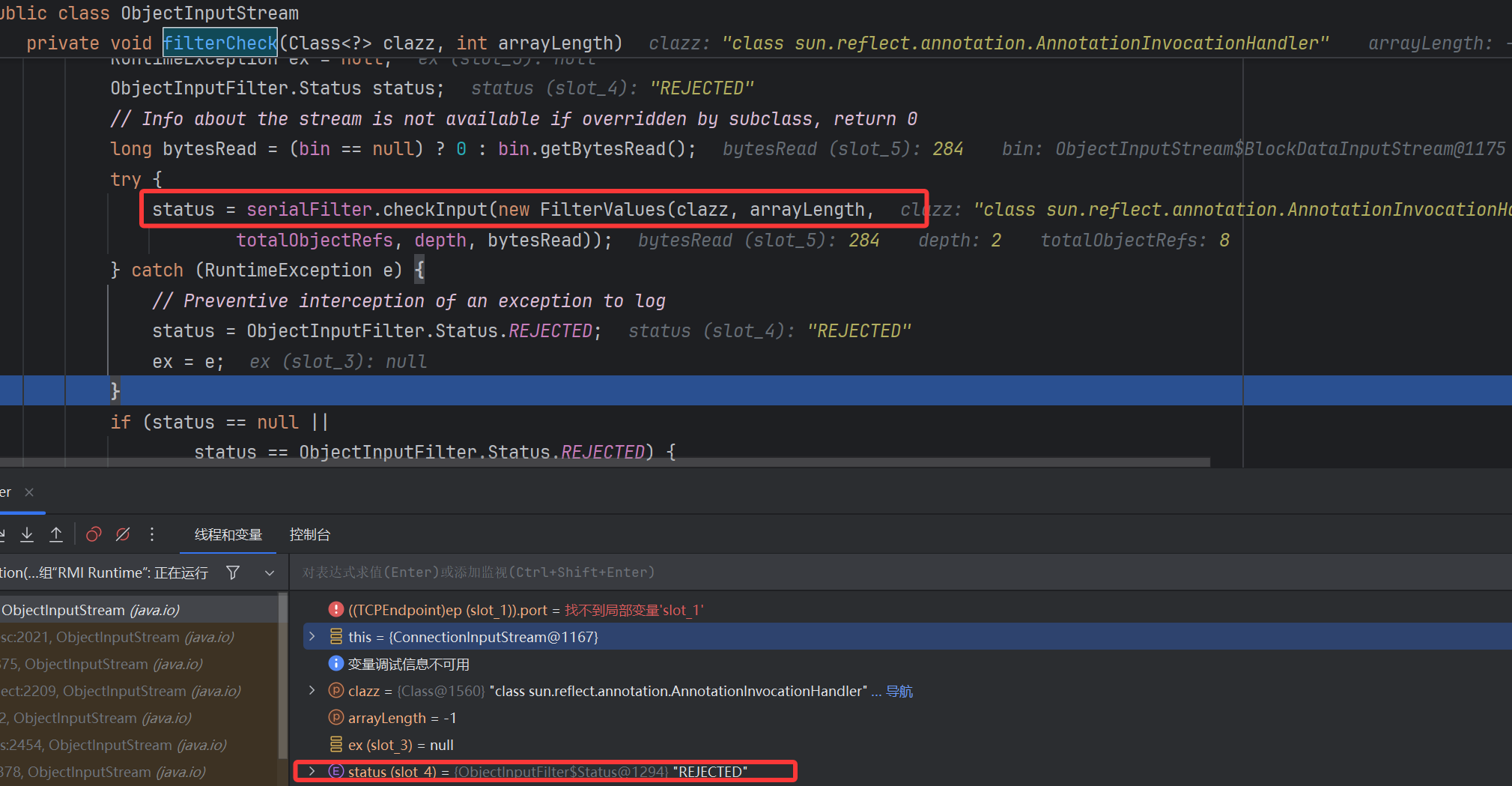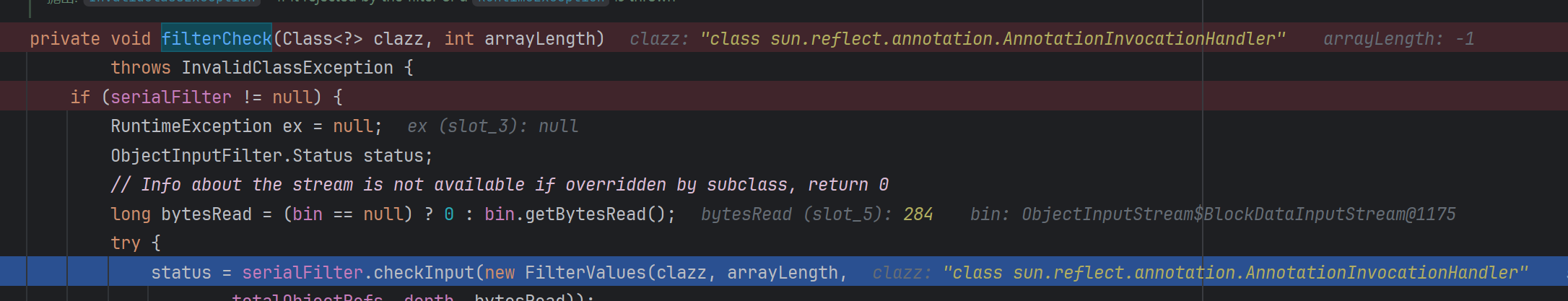后续跟进发现进到了下的断点方法 ObjectInputStream.filterCheck