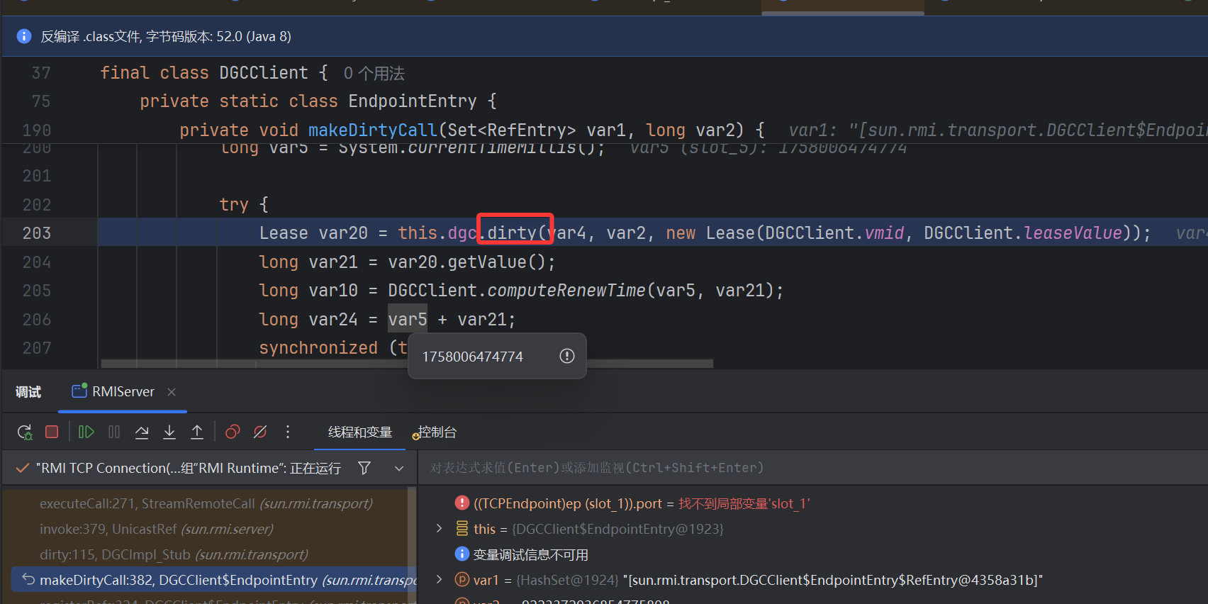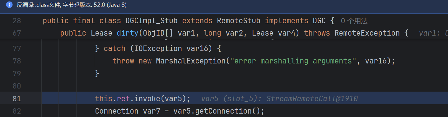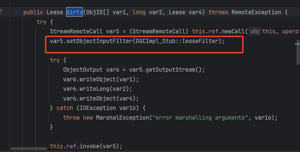 修复点二:一的修复已经是可以的,第二点还在 DGCImpl_Stub#dirty 里面做了修改,在执行 newCall 发起 JRMP 请求之后设置里一个过滤,才进行 ref.invoke 反序列化解析