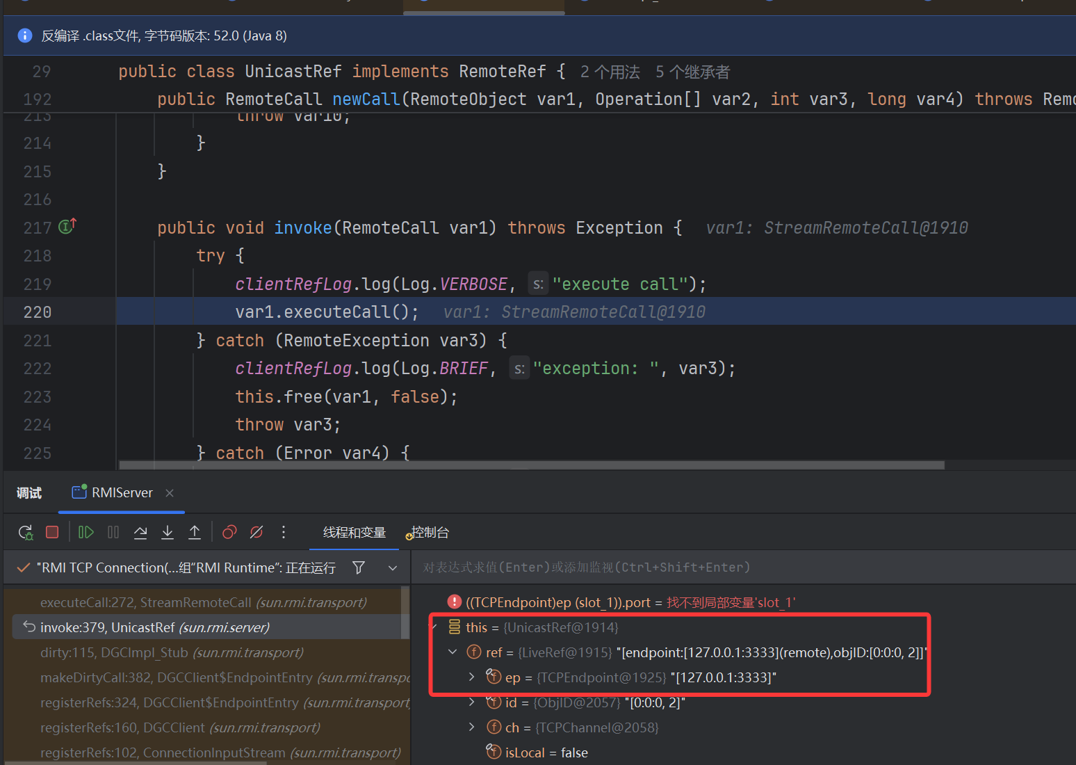 该方法里调了 super.ref.newCall ,super.ref.invoke()—>StreamRemoteCall.executeCall 对于返回一定条件会直接反序列化,造成反序列化漏洞