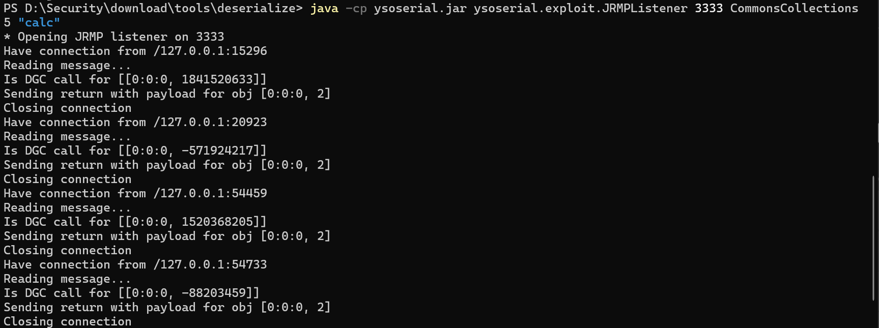 用 ysoserial 相当于重构了一个 JRMP 服务端,攻击用的是 cc5