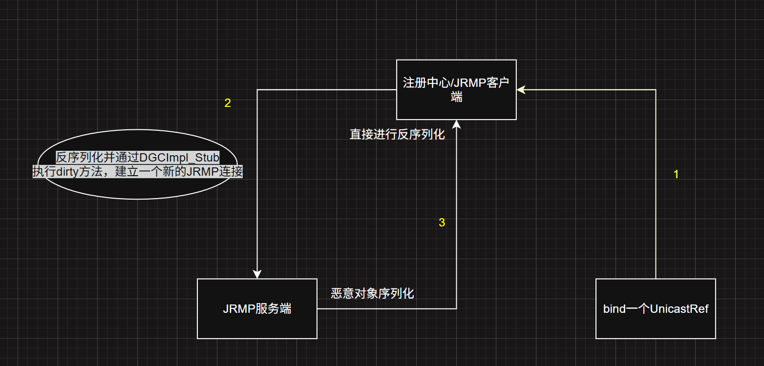 也可以说注册中心反序列化 UnicastRef 之后,它就可以看作一个JRMP 客户端 ,向恶意服务端端发起 dirty 请求建立一个JRMP 连接 到用 ysoserial 开启的 JRMP 服务端,这样就类似于一个服务端攻击客户端了