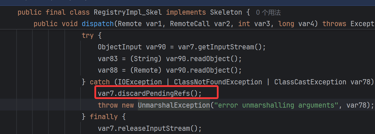 修复点 修复点一:不论哪种方法,注册中心的分发进行反序列化后抛出异常就会消除 ref,就是一个建立新的 JRMP 连接的重要东西