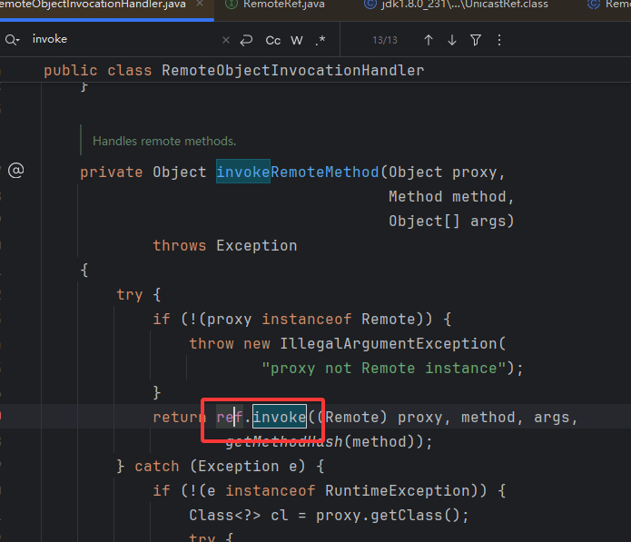 那就来到了客户端发起 JRMP 连接的地方了 UnicastRef.invoke,这里的流程还是和 RMI 基础中的 RMI 类比动态代理一样样,先是客户端代码层面的调用处理器,然后客户端的引用 UnicastRef 建立 JRMP 连接并反序列化返回的数据,服务端就省略了….