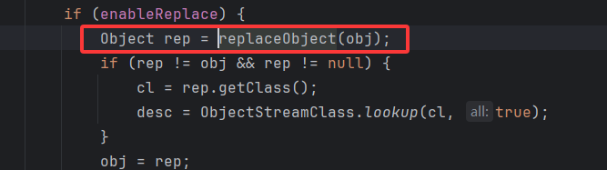 1 2 3 4 5 6 7 8 9 10 protected final Object replaceObject(Object var1) throws IOException { if (var1 instanceof Remote && !(var1 instanceof RemoteStub)) { Target var2 = ObjectTable.getTarget((Remote)var1); if (var2 != null) { return var2.getStub(); } } return var1; }