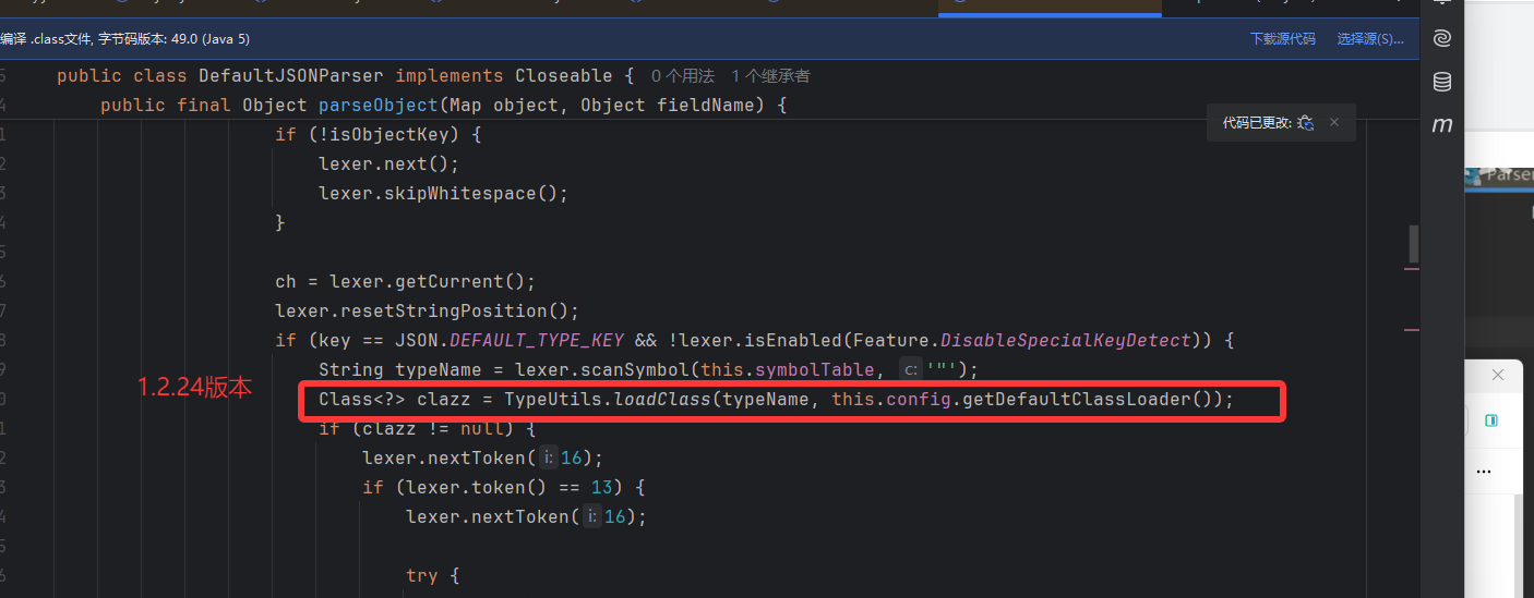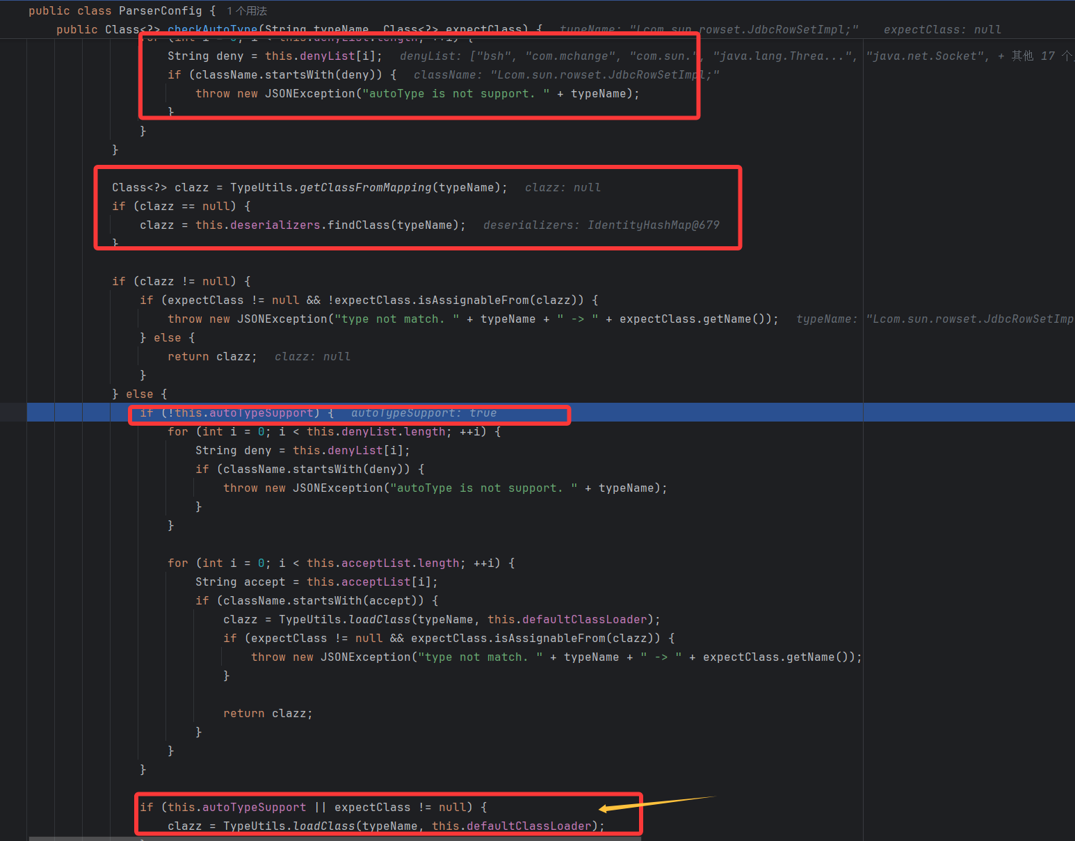 简单说一下该方法:autoTypeSupport 默认是 false 关着的,会从缓存中查找类,然后黑名单遍历,把前面利用链的包基本都给禁了。autoTypeSupport 开着也会进行白名单检测,黑名单过滤。