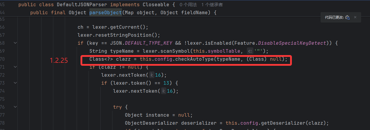 不一样的点是在 DefaultJSONParse.perseObject 方法里面,当检测到含有@type 的时候,修复点调用的是 checkAutoType()