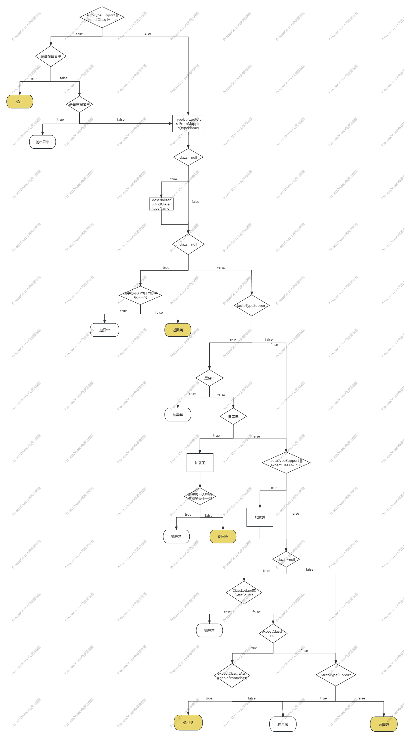 二.分析 checkAutoType() 1 2 3 4 5 6 7 8 9 10 11 12 13 14 15 16 17 18 19 20 21 22 23 24 25 26 27 28 29 30 31 32 33 34 35 36 37 38 39 40 41 42 43 44 45 46 47 48 49 50 51 52 53 54 55 56 57 58 59 60 61 62 63 64 65 66 67 68 69 70 71 72 73 74 75 76 77 78 79 80 81 82 83 84 85 86 87 88 89 90 91 92 93 94 95 96 97 98 public Class<?> checkAutoType(String typeName, Class<?> expectClass) { if (typeName == null ) { return null ; } else { String className = typeName.replace('$' , '.' ); if (this .autoTypeSupport || expectClass != null ) { for (int i = 0 ; i < this .acceptList.length; ++i) { String accept = this .acceptList[i]; if (className.startsWith(accept)) { return TypeUtils.loadClass(typeName, this .defaultClassLoader); } } for (int i = 0 ; i < this .denyList.length; ++i) { String deny = this .denyList[i]; if (className.startsWith(deny)) { throw new JSONException ("autoType is not support. " + typeName); } } } Class<?> clazz = TypeUtils.getClassFromMapping(typeName); if (clazz == null ) { clazz = this .deserializers.findClass(typeName); } if (clazz != null ) { if (expectClass != null && !expectClass.isAssignableFrom(clazz)) { throw new JSONException ("type not match. " + typeName + " -> " + expectClass.getName()); } else { return clazz; } } else { if (!this .autoTypeSupport) { for (int i = 0 ; i < this .denyList.length; ++i) { String deny = this .denyList[i]; if (className.startsWith(deny)) { throw new JSONException ("autoType is not support. " + typeName); } } for (int i = 0 ; i < this .acceptList.length; ++i) { String accept = this .acceptList[i]; if (className.startsWith(accept)) { clazz = TypeUtils.loadClass(typeName, this .defaultClassLoader); if (expectClass != null && expectClass.isAssignableFrom(clazz)) { throw new JSONException ("type not match. " + typeName + " -> " + expectClass.getName()); } return clazz; } } } if (this .autoTypeSupport || expectClass != null ) { clazz = TypeUtils.loadClass(typeName, this .defaultClassLoader); } if (clazz != null ) { if (ClassLoader.class.isAssignableFrom(clazz) || DataSource.class.isAssignableFrom(clazz)) { throw new JSONException ("autoType is not support. " + typeName); } if (expectClass != null ) { if (expectClass.isAssignableFrom(clazz)) { return clazz; } throw new JSONException ("type not match. " + typeName + " -> " + expectClass.getName()); } } if (!this .autoTypeSupport) { throw new JSONException ("autoType is not support. " + typeName); } else { return clazz; } } } }