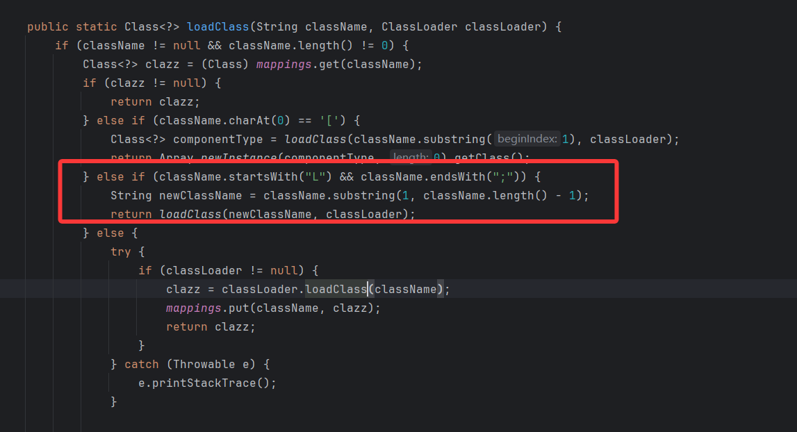 当检测到 ClassName 以 L 开头;结尾,就会截取之间的内容,所以正常进行了类加载