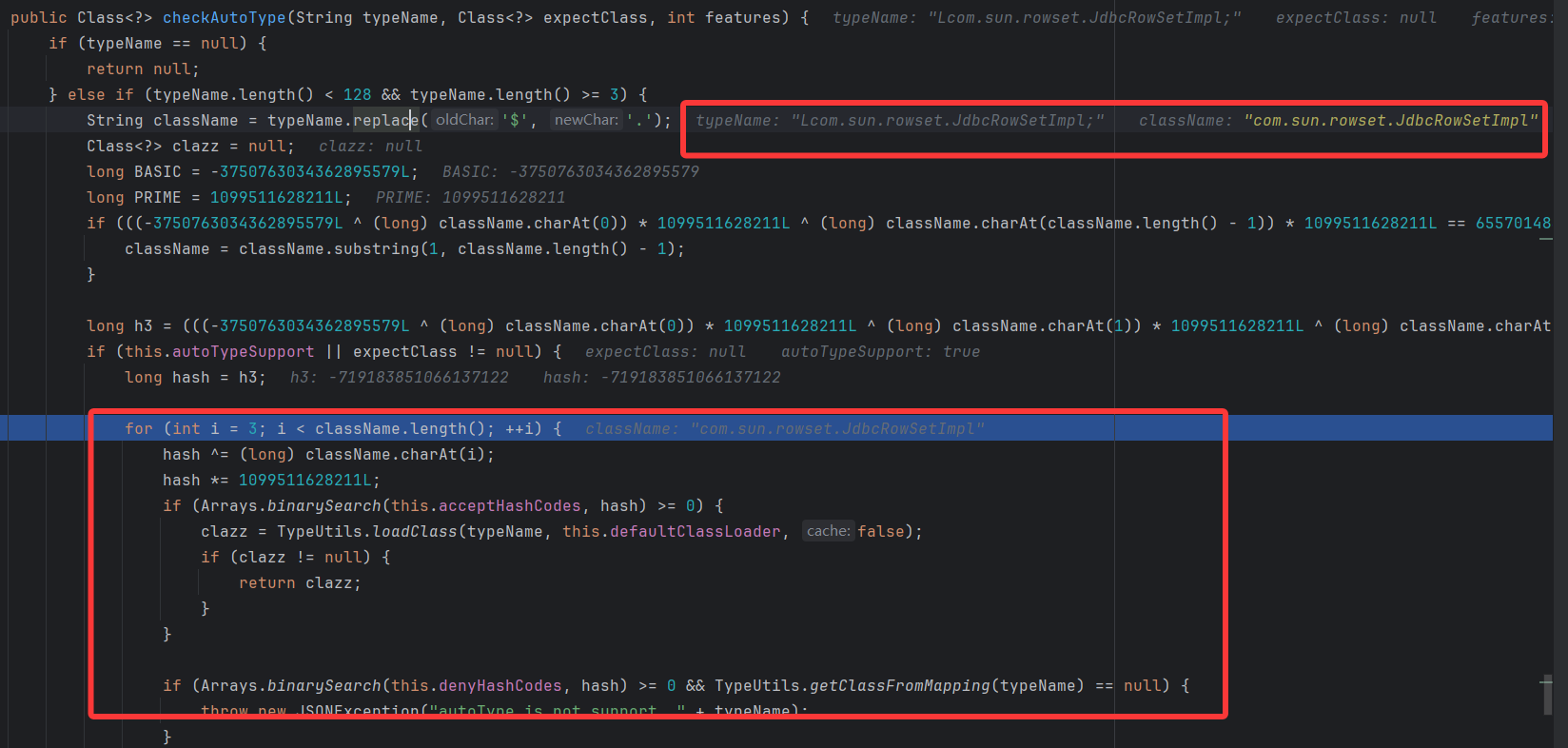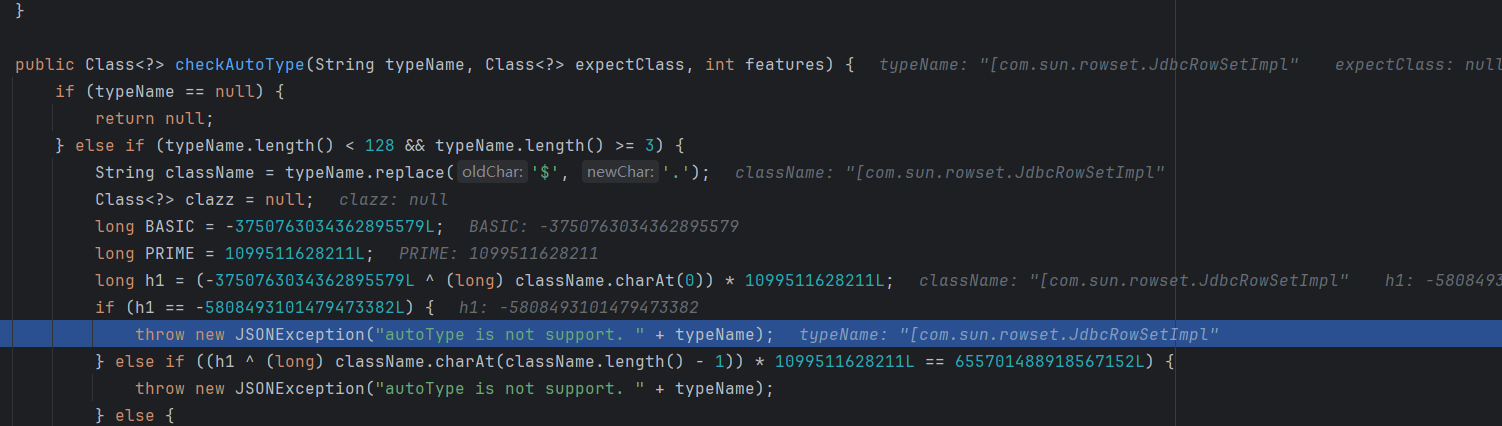 然后当解析第二部分 JSON 数据时,由于前面我们已经将 JDBC RowSetImpl 记载到缓存中,就在 checkAutoType 这个函数中从内存中获得后直接返回了,从而绕过了黑名单的检测