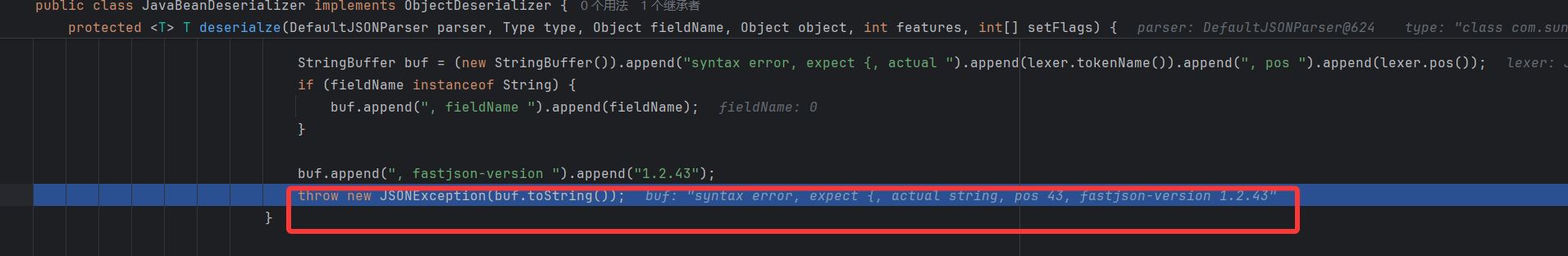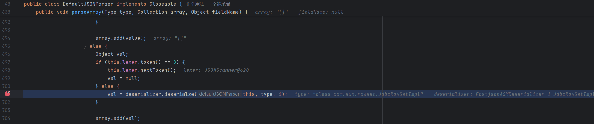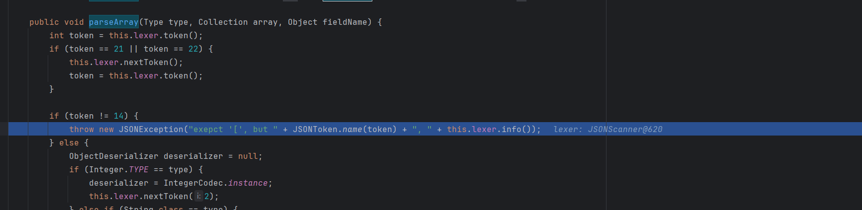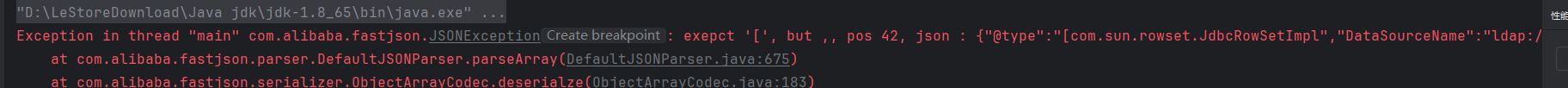 分析 跟进发现是在获取反序列化解析器后,反序列化时调用了反序列化数组的方法 parseArray,需要满足一些条件才不报错,加上[,{