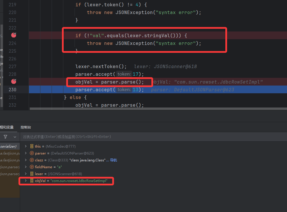 然后调用 deserialize,该方法中判断键是否是 val 不是进行报错,是的话将值赋给 objVal,后续接着再赋值给 strVal,就是上面 loadClass 方法写入缓存中的那个字符串 strVal,现在前后都连接起来了