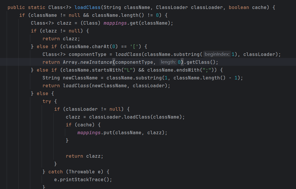 来看以下绕过原理,我们将开关打开,执行逻辑会遍历白名单,黑名单并且黑名单绕过去了,然后从缓存中没有找到因为我们之前也没有写,缓存这里后续的绕过会用到。然后就是一个有意思的 loadClass