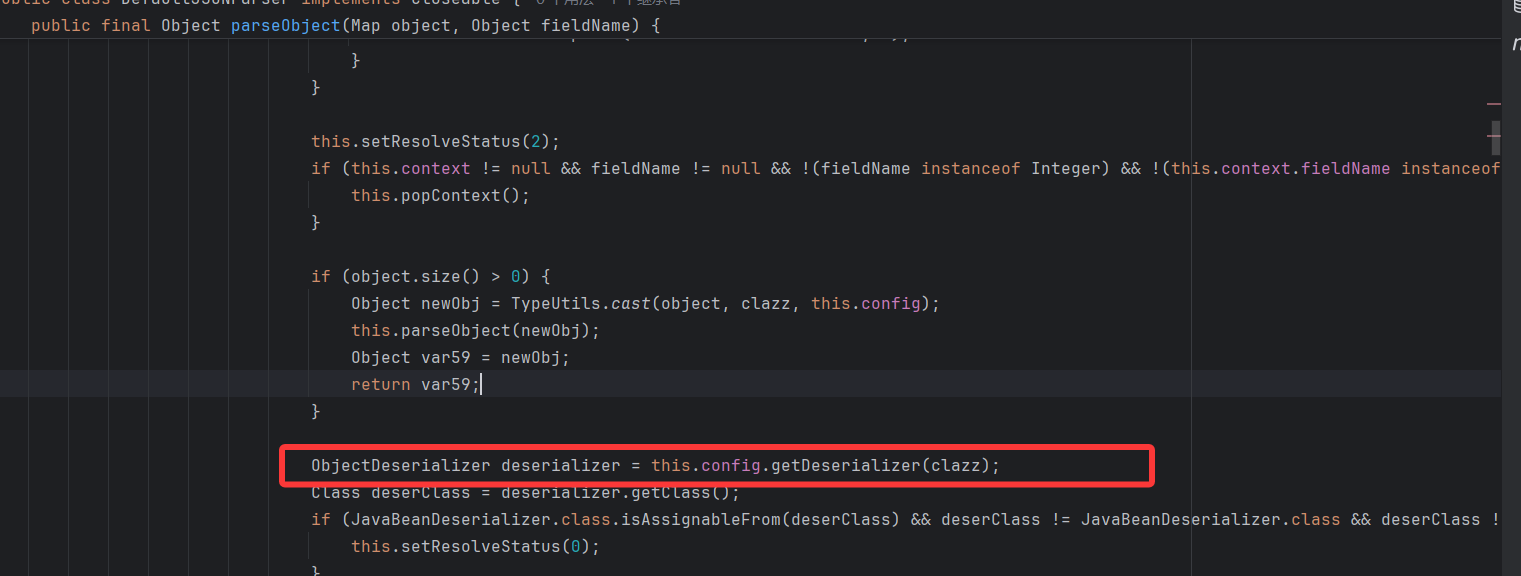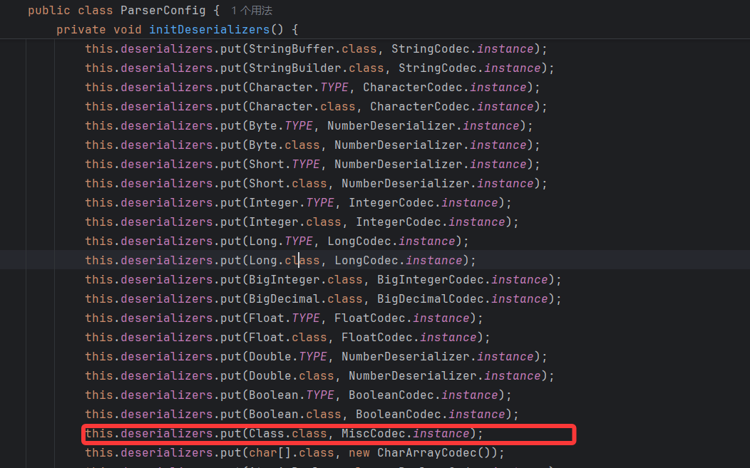 接着看怎么调用 MiscCode.deserialze 方法,MiscCodec 继承 ObjectSerializer,ObjectDeserializer,是序列化反序列化解析器,而我们回想 FastJson 反序列化会检测到@type 时要获取 java 解析器再调用反序列化方法,它获取的解析器是 JavaBeanDeserializer,这个反序列化器是从缓存 config(ParserConfig 类型)中获取的,所以从 config 中获取到 MiscCode 反序列化器就行了