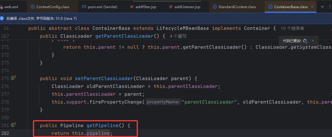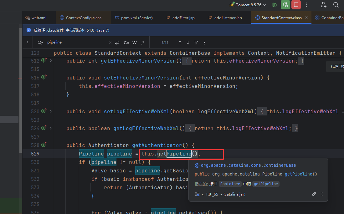 Pipeline 实现类为 StandardPipeline,它无法直接获取,结合我们之前能获取到 standardContext 的经验,就去 StandardContext 里面看看有没有能获取到 StandardPipeline 的手段,注意到下图这个方法里有东西,跟进去看一下