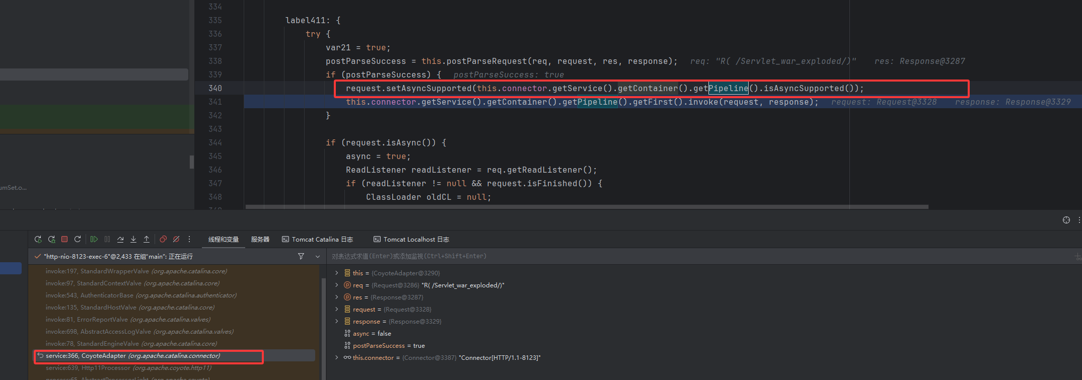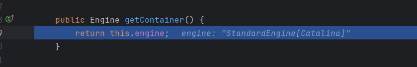 回看之前接收 http 请求后,来到的适配器方法这里,他首先获得的第一层容器是 Engine,如下图: