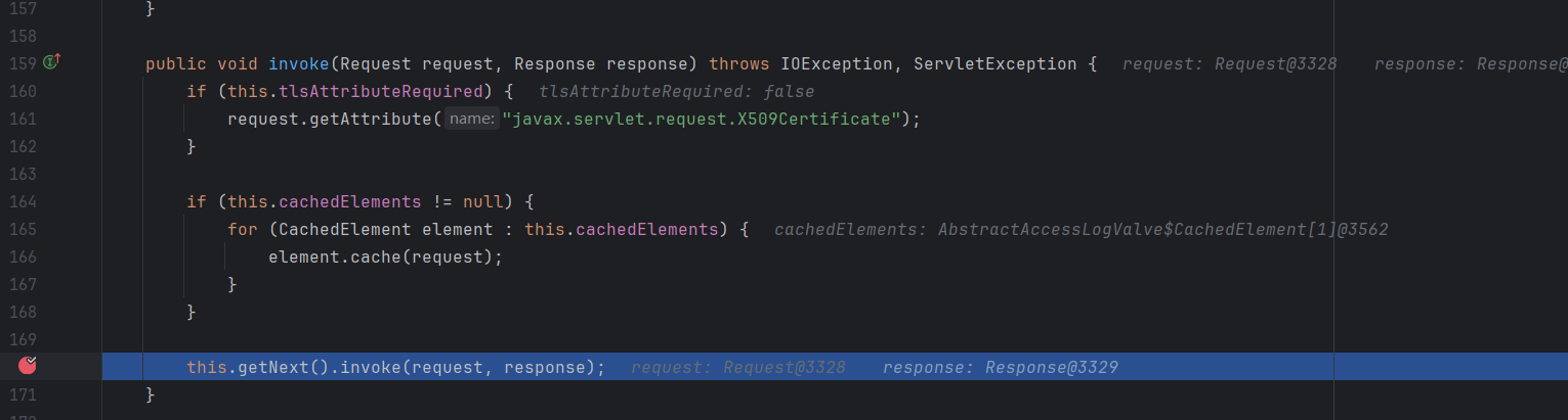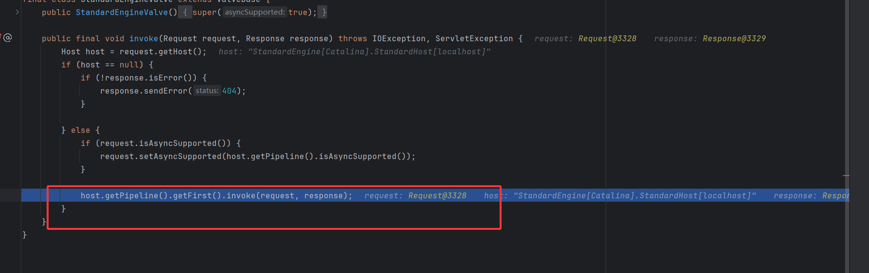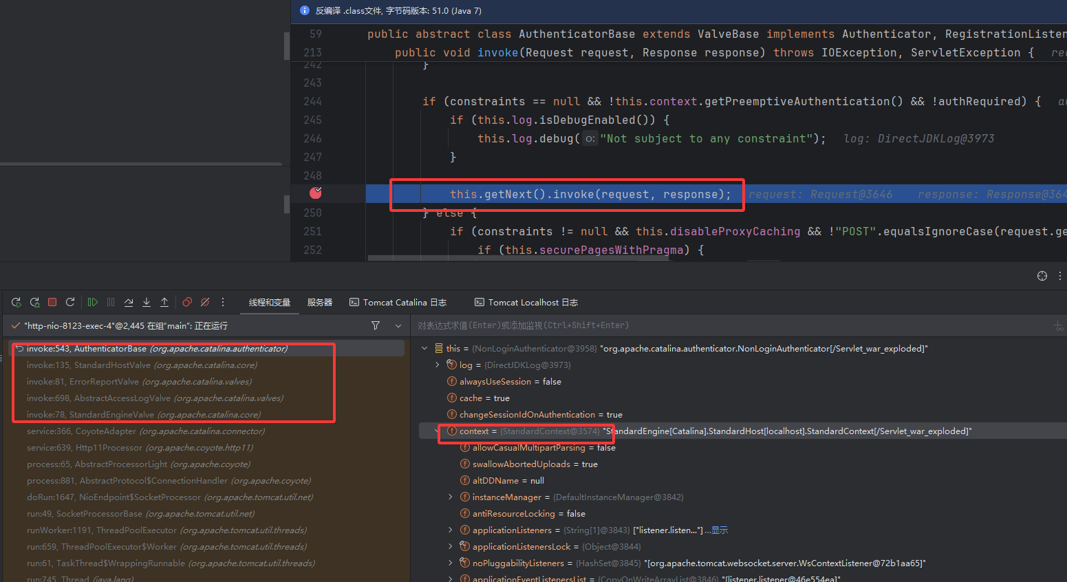 对对对这里就是之前分析的时候遇到的很多 invoke,见下图,但是这里访问后调试到这里进入不去了,现在是在 context,getNext()获取的是 context 中 pipeline 的下一个 valve