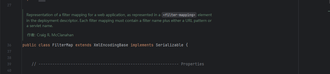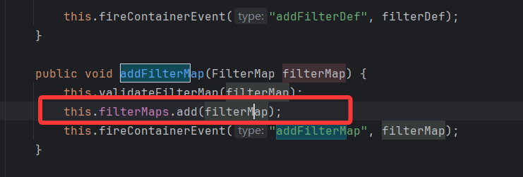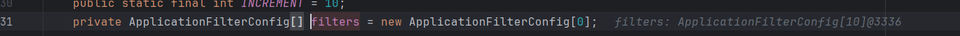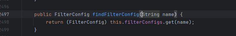 这里看到遍历从 context 中获取的 filterConfig 被添加到 filterChain 中了,并且获取方法它的参数 filterMap 因为也是从 Context 中获取的,所以应继续跟进 context,为保证后面的构造能正常执行去看看 context 中的 filterMap 和 filterConfig 构造吧