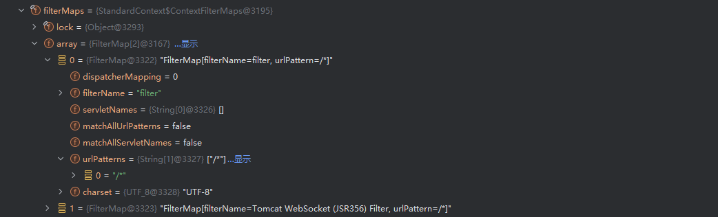 filterMaps 中以 array 的形式存放各 filter 的路径映射信息,其对应的是 web.xml 中的标签