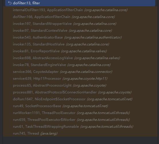 在 dofilter 方法处下断点,之后访问/filter 就进入调试了。调用栈如下图,逆向进行分析怎么调用 filter 的