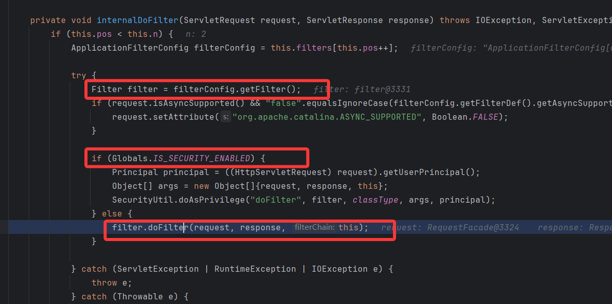 Globals.IS_SECURITY_ENABLED 判断是否启用了容器级安全,没有启用直接进行后面的 dofilter 方法调用,也就是我们写的 filter 方法的调用