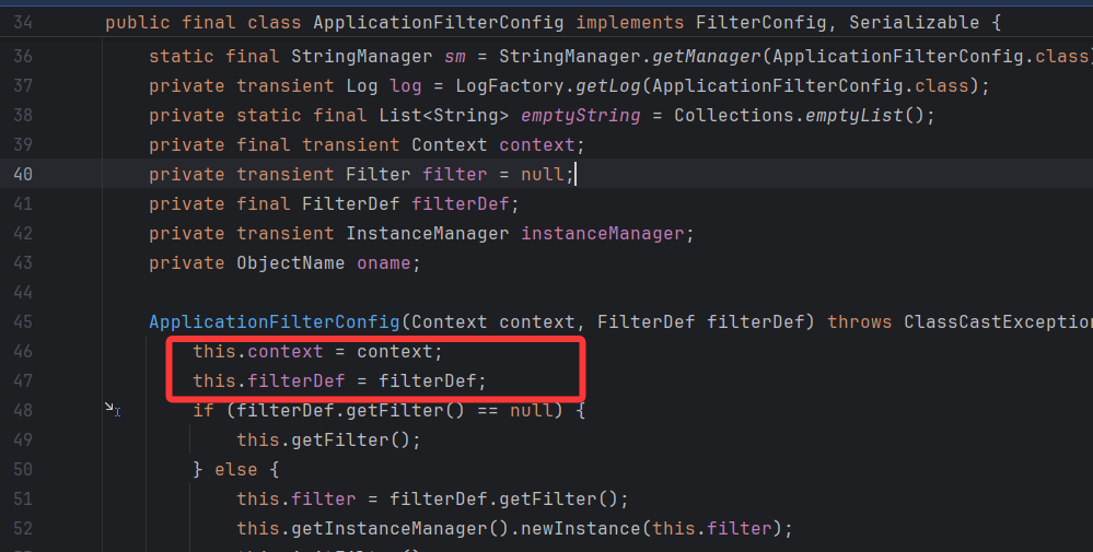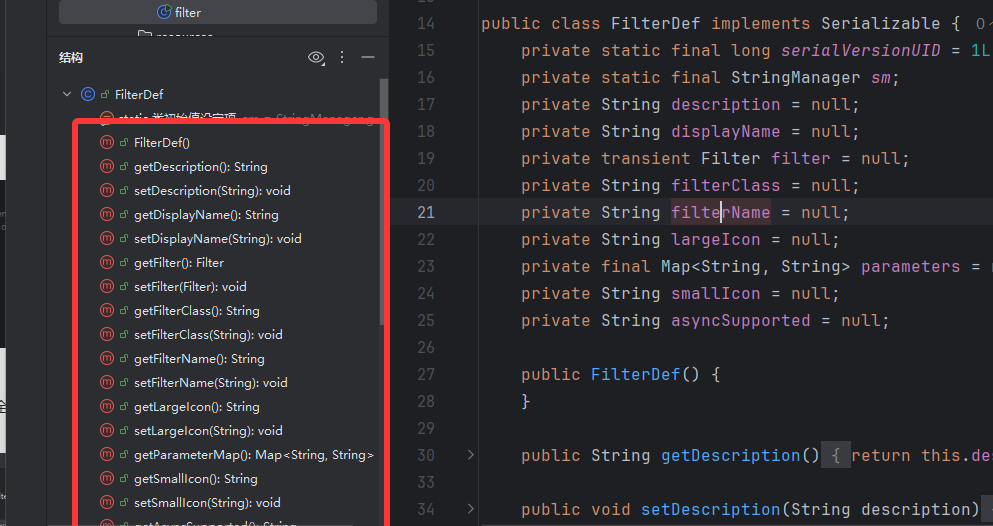 既然要反射创建,看看构造函数 ApplicationFilterConfig 类的构造函数中有两个属性,看 filterDef 这个类是一个标准的 JavaBean,所以就找到了可以上手的点,setter 方法
