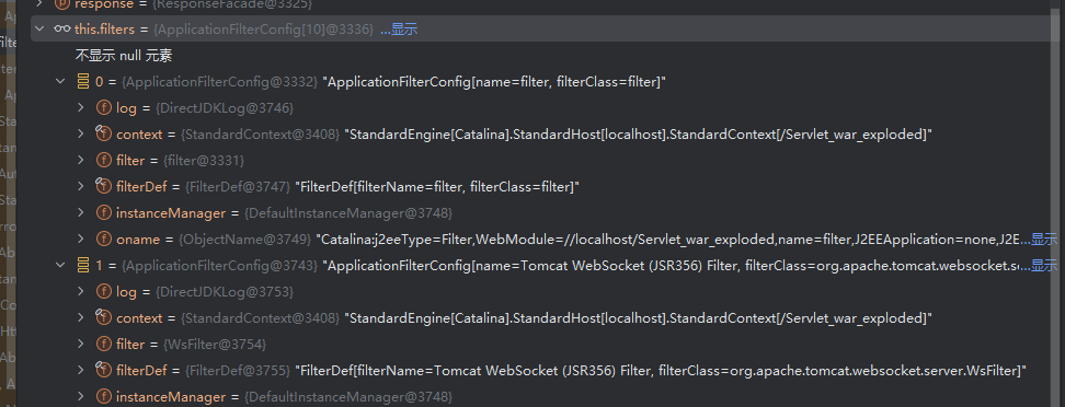 跟进上下文 StandardContext 调用的获取方法 findFilterConfig,属性 filterConfigs 是一个 hashMap,value 是 ApplicationFilterConfig 类的