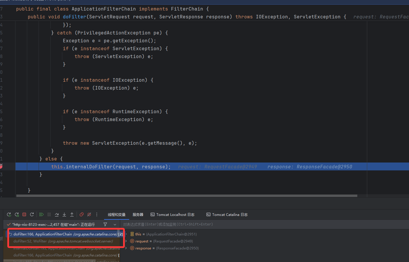 先从最近的这条看,ApplicationFilterChain.internalDoFilter
