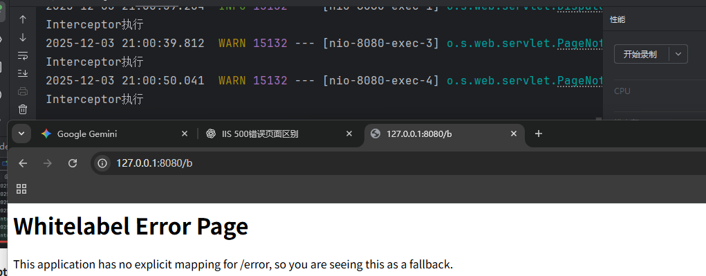 因为我们代码设置的就是所有页面都经过,所以访问任意页面都能看到输出 Interceptor 执行