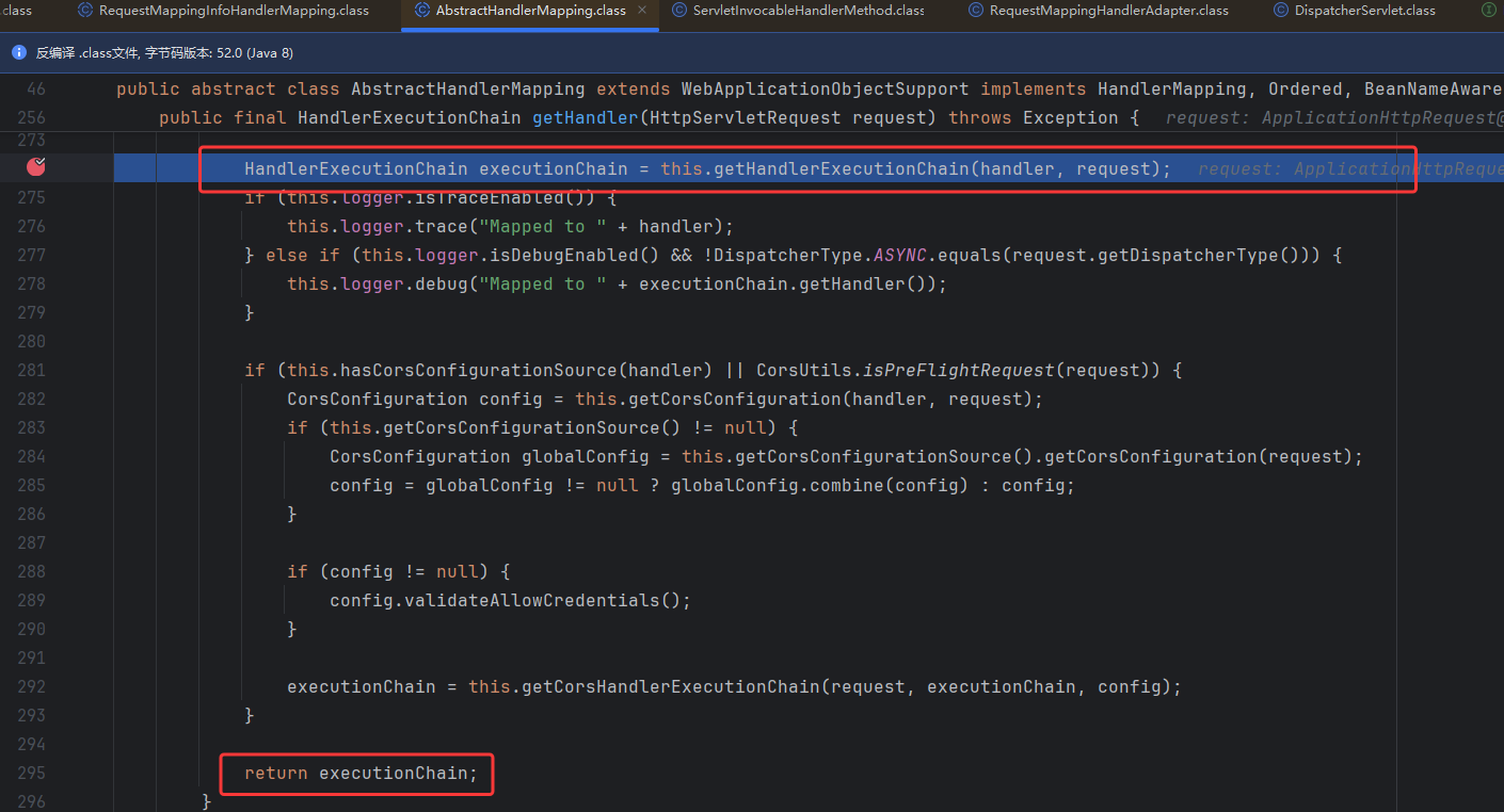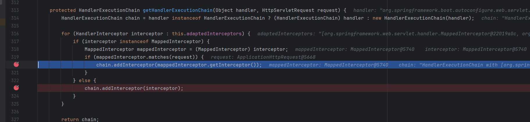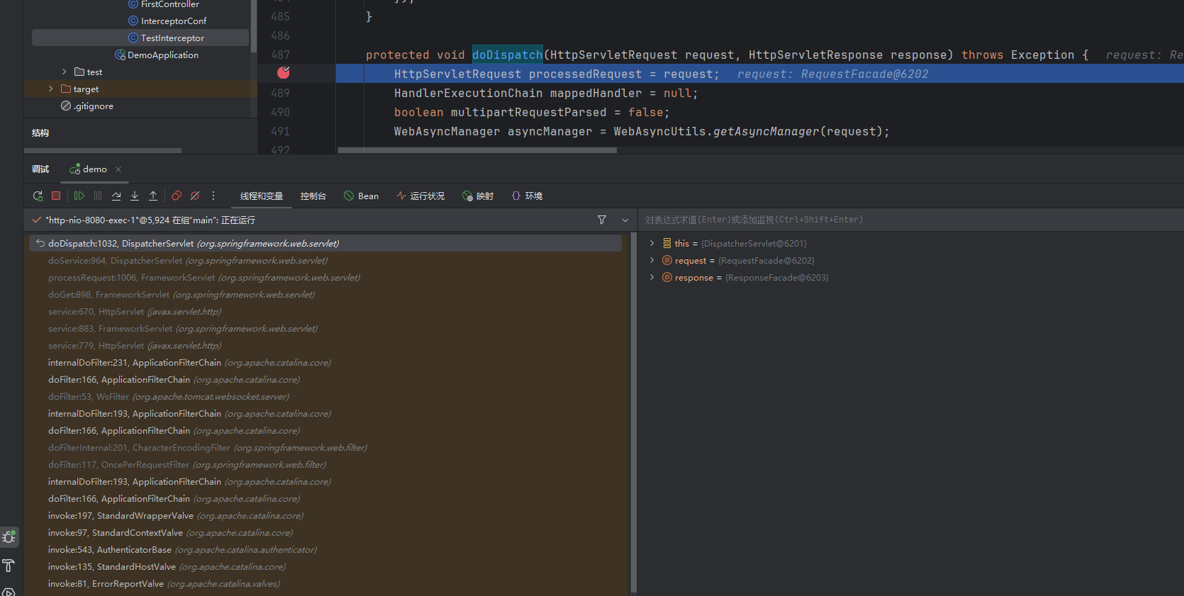 Interceptor 是介于 HandlerMapping 与 Controller 之间,也是属于 spring mvc 框架层的。那么我们下断点就下到 spring MVC 的入口点 DispathcerServlet 的 doDispatch 方法中
