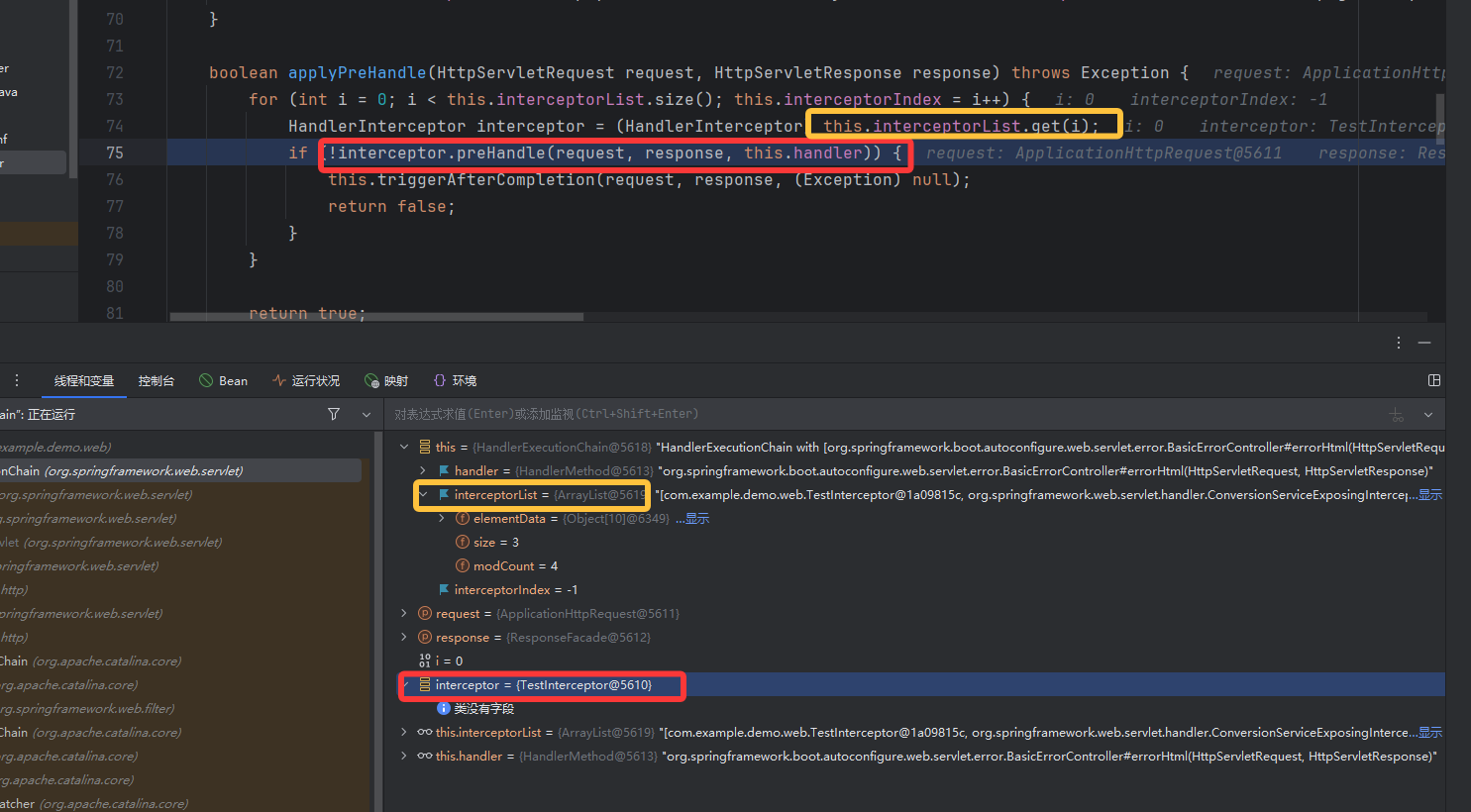 从属性值 interceptorList 中遍历获取 interceptor 然后调用 preHandle 方法,我们就往前跟着调用栈看,分析调用该方法的实例化对象 HandlerExecutionChain