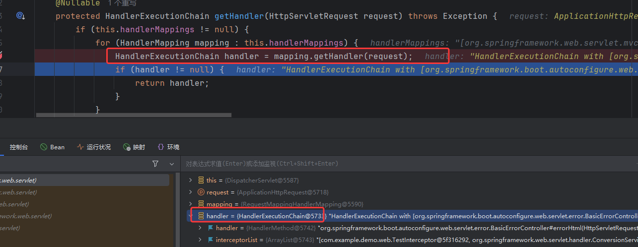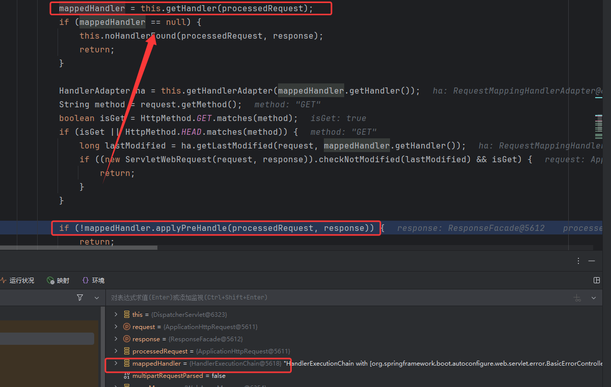 现在是在前端控制器 DispatcherServlet 中遍历属性 handlerMappings,赋值给 mapping,可以看到 mapping 是 RequestMappingHandlerMapping 类的,getHandler 从它里面获取 handler