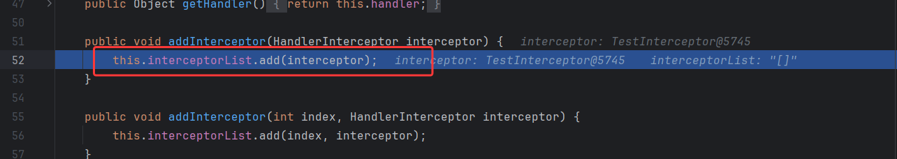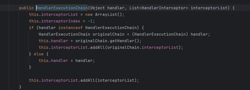 最后就找到了,传给方法的参数 handler 传进构造函数进行实例化创建。但是见下图二:handler 和我们需要利用的属性 interceptorList 并没有太大的关系
